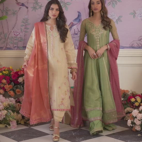 An ethereal shade of pale gold with a subtly shimmering, zari sheen is completely hand embellished with zardozi, sequins, Swarovski crystals and silk thread work in hues of pink and aqua for that ultimate pop of colour.