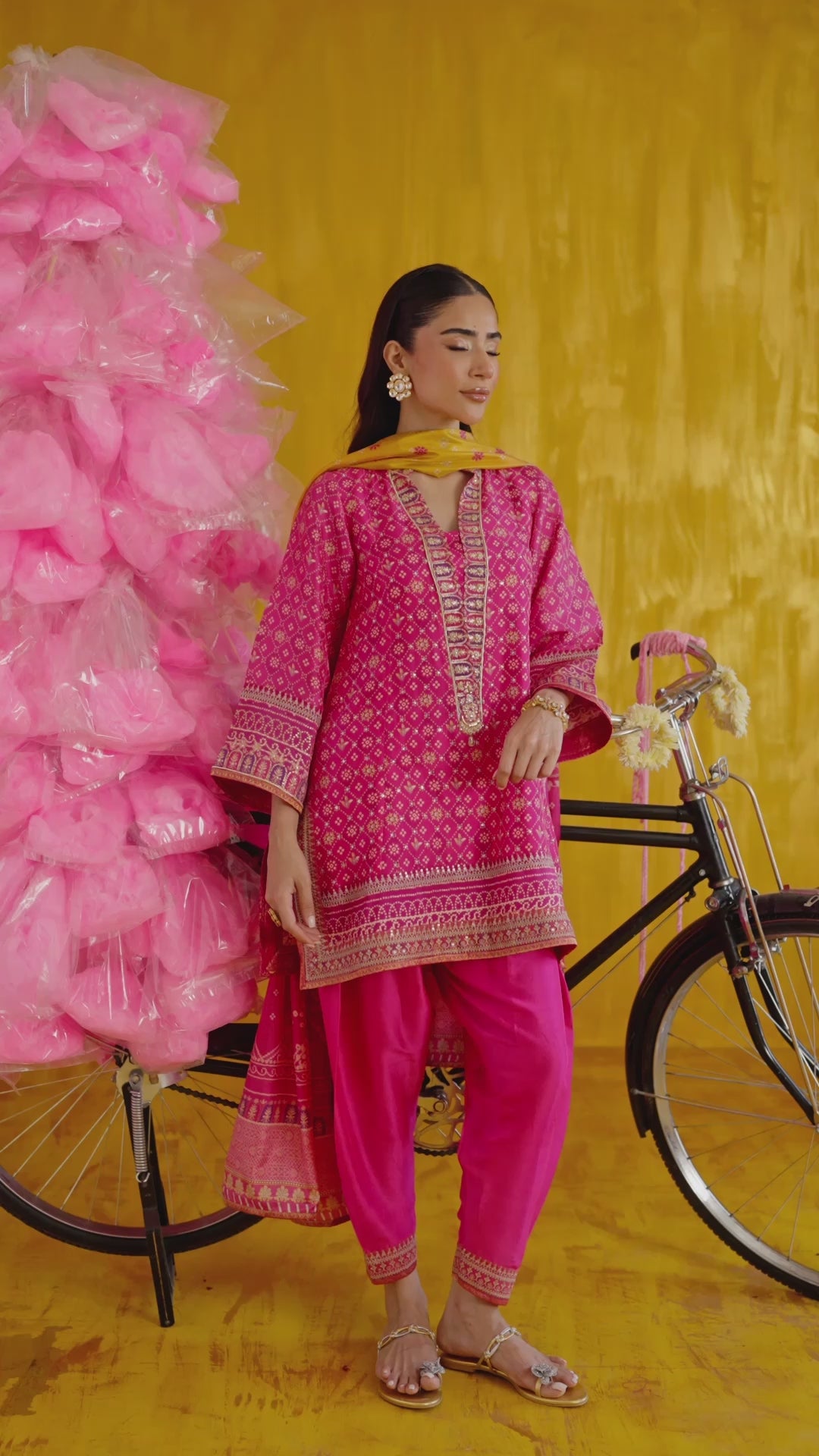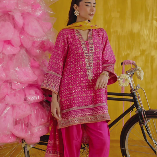 A vibrant nod to modern-day glamour, this digitally printed, hot pink raw silk ensemble is designed to flatter and endure. The thigh-skimming shirt, richly hand-embellished with sequins, gota, and aari, is universally flattering, while the tapered raw silk shalwar ensures timeless versatility. The pure medium silk dupatta is given an eye catching ombre treatment
