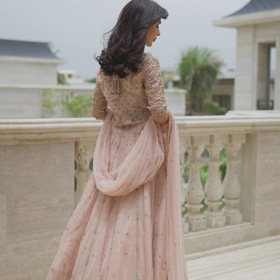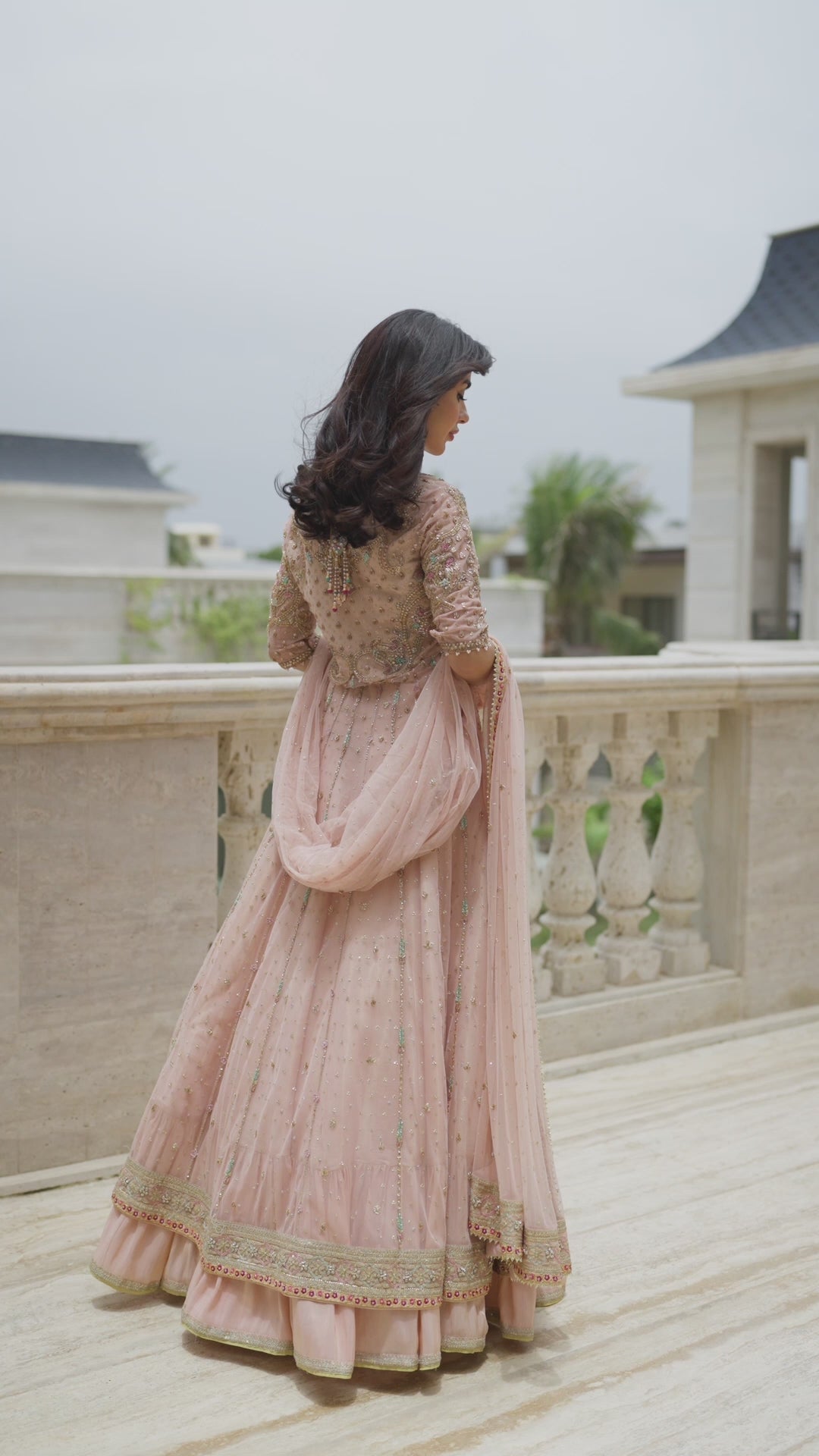 Infused with the softness of peach, this kalidaar embodies artisanal heritage with refined elegance. Crafted in pure net, its voluminous silhouette is delicately adorned with floral bootis and scattered chan, while intricate handwork in kora, dabka, and resham graces its panels with timeless artistry. A handworked border completes the kalidaar, lending depth and sophistication to its graceful flow. Paired with a richly textured zari silk lehnga, the ensemble balances opulence with ethereal charm. The look is crowned with a pure net dupatta, lightly sprinkled with chan and finished with detailed handworked borders, framing the ensemble in cohesive refinement. A true celebration of craft and tradition, this peach kalidaar is designed for moments of festivity and grandeur — romantic, timeless, and exquisitely classic.
