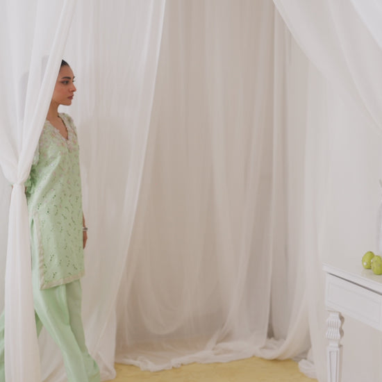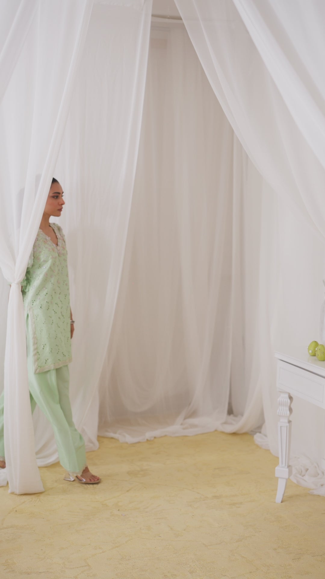 Steal the moment this season and every season that follows with the absolutely stunning Nikol Mint ensemble. Cut from intricately embroidered raw silk in a fresh mint green hue, it is immaculately tailored to create a contemporary, universally flattering silhouette.