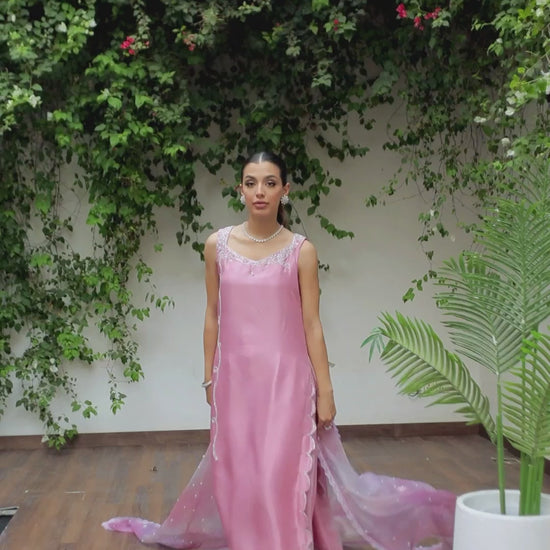 A divine shade of lilac raw silk is adorned with delicate neckline and shoulder straps are hand-worked shimmering silver and pearls.