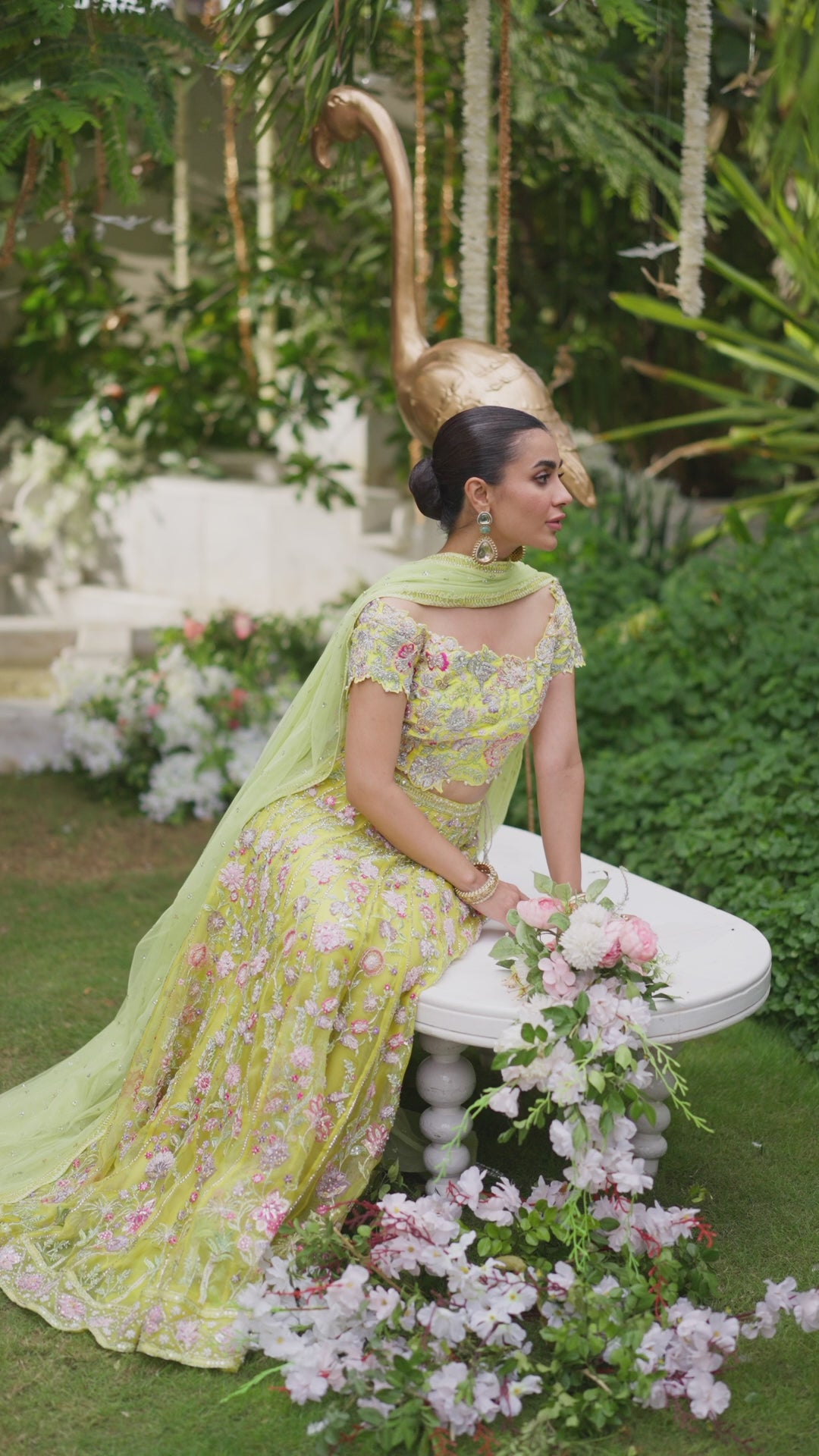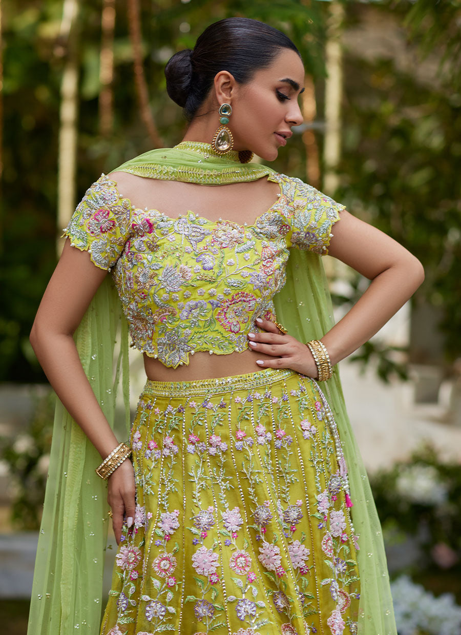 Definitely a color to own this festive season. A stunning kiwi choli featuring a multitude of complementing colors is a masterpiece of handwork, adorned with sitara, French knots, dabka, and threadwork across its entirety. The ensemble features a lehenga with organza panels with intricate embellishments which enhance the richness and allure of the lehenga, making it a focal point of the outfit. Completing the ensemble is a fresh green net dupatta, embellished with heavy all-over sitara chann for a shimmering effect. The dupatta is bordered with zari detailing all around, adding a luxurious touch. It is finished with vibrant tassels on the corners, adding a playful and festive flair to the overall look. This ensemble is a perfect blend of traditional craftsmanship and contemporary design, ideal for making a statement at any celebratory occasion.