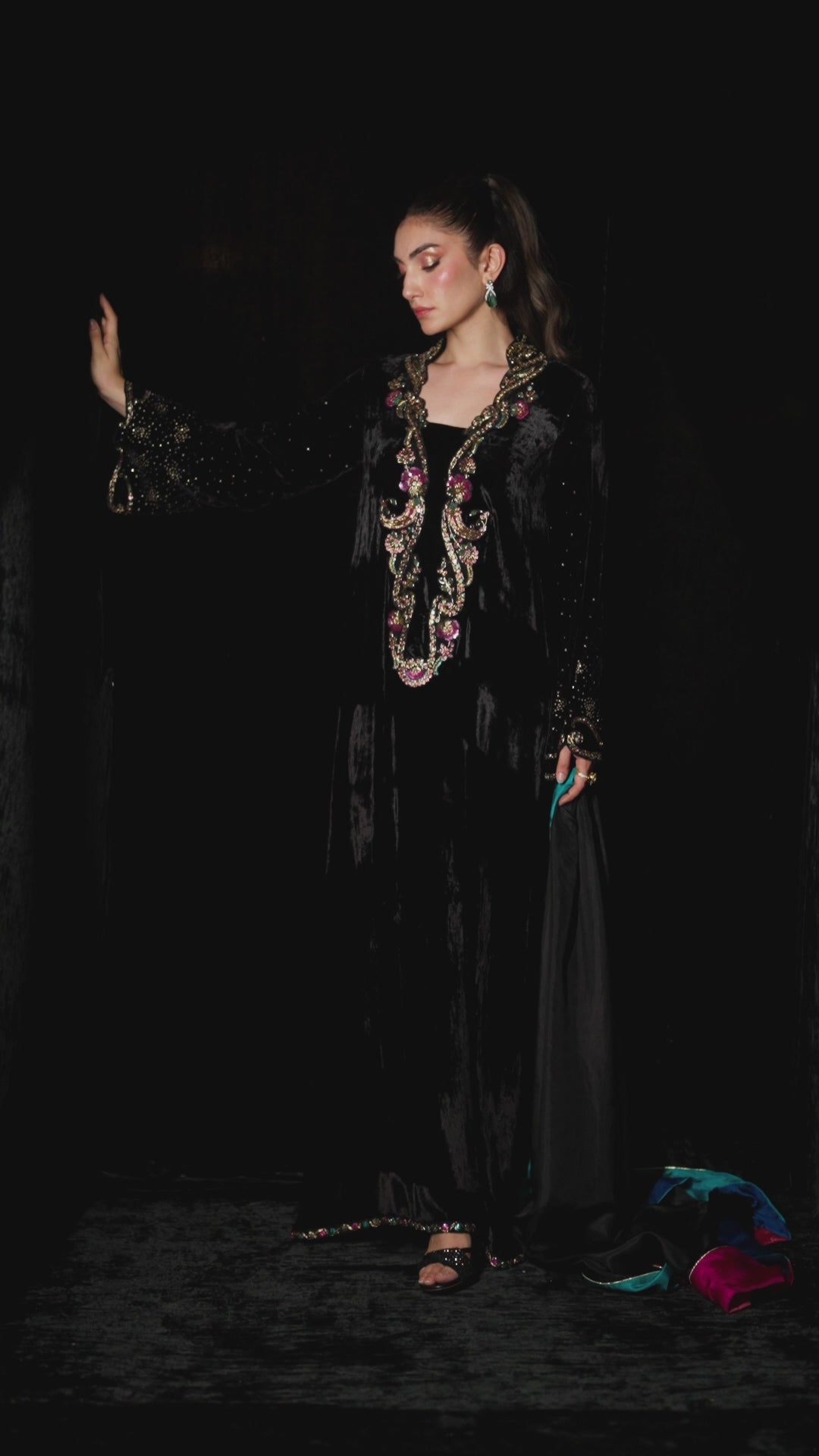 The Nori Kaftan radiates effortless, eternal glamour — an embodiment of timeless sophistication. Cut in a fluid silhouette, the neckline glistens with exquisite handwork featuring intricate gold tilla and dabka, accentuated by delicate sequin floral motifs. The embellishment flows gracefully onto the sleeves, creating a beautifully balanced harmony of detail and design. Shimmering sequins capture the light with every movement, adding just the right touch of festive sparkle. A striking style statement, this kaftan promises to leave a lasting impression at any celebration.