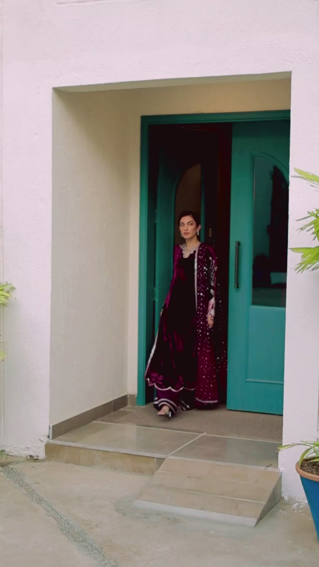 The ultimate must-have colour for this winter’s festivities, to ensure that all eyes are on you at any special occasion. This forever flattering silhouette is cut from a plush velvet in the most popular shade of season, a striking plum hue. Adorned with intricate silver embellishments on the neckline and fully hand embroidered sleeves with appliques. This outfit is going to be your immediate choice for an unforgettable wedding look.
