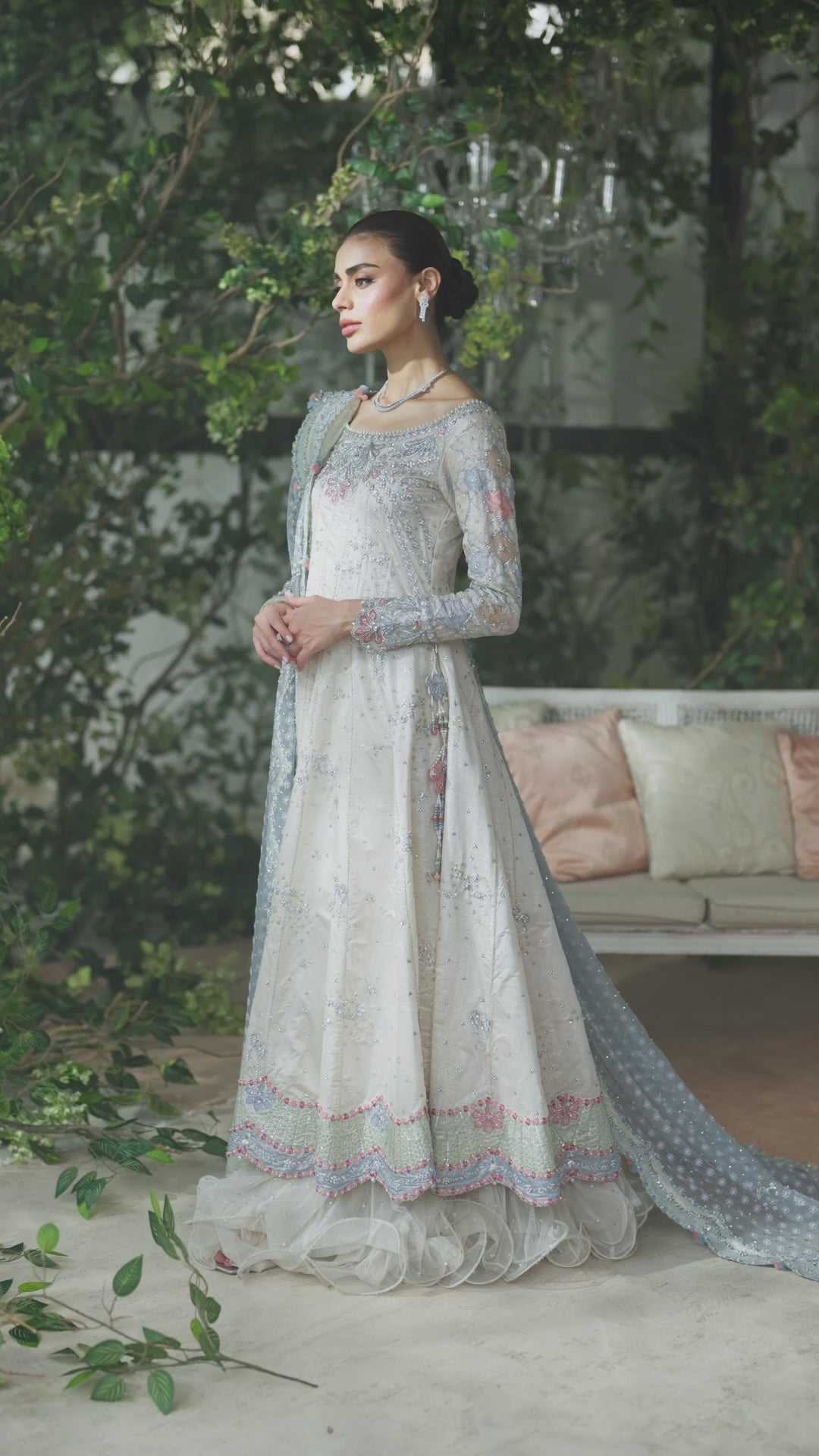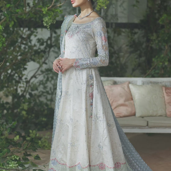 A timeless vision of opulence, this silver zari kalidaar is exquisitely crafted for the modern bride with a love for classic craftsmanship. The neckline is richly embellished with a mix of pearls, stones, sequins, dabka, gotta, mukaish, and bold contrasting appliqués — creating a stunning interplay of texture and sheen.