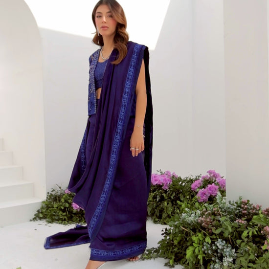 Ocean Navy Draped Saree with Cutwork Embellished Cape