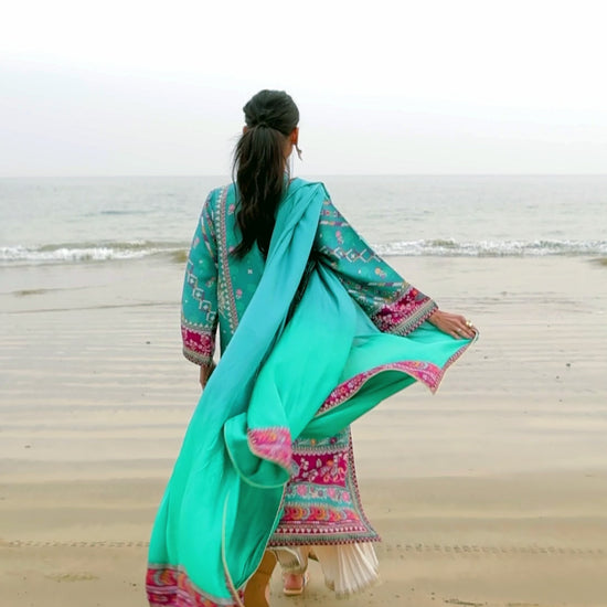 The elegant, straight shirt is paired with a pure medium silk dupatta in coordinating cool blue, trimmed with organza borders embroidered with ivory blooms.Finish the look with our pure silk, schiffli pants (as pictured) and sparkly heels for an ultra-glam, timeless look!