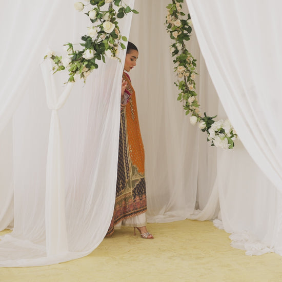 Cut from pure raw silk the shirt had an exclusively designed FTA digital print in lovely fall hues and embroidery on the neckline and sleeves. The accompanying pure medium silk dupatta with stunning embroidered borders completes your ensemble. Eternally stylish, irresistible details will make this one of your smartest buys this season!