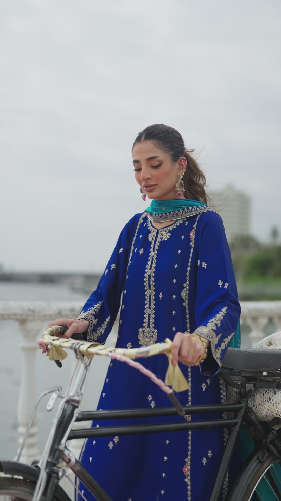 Completing your ensemble is a two tone, pure raw silk dupatta in a gorgeous teal hue, trimmed with gold embroidery and dotted all over with sequins.