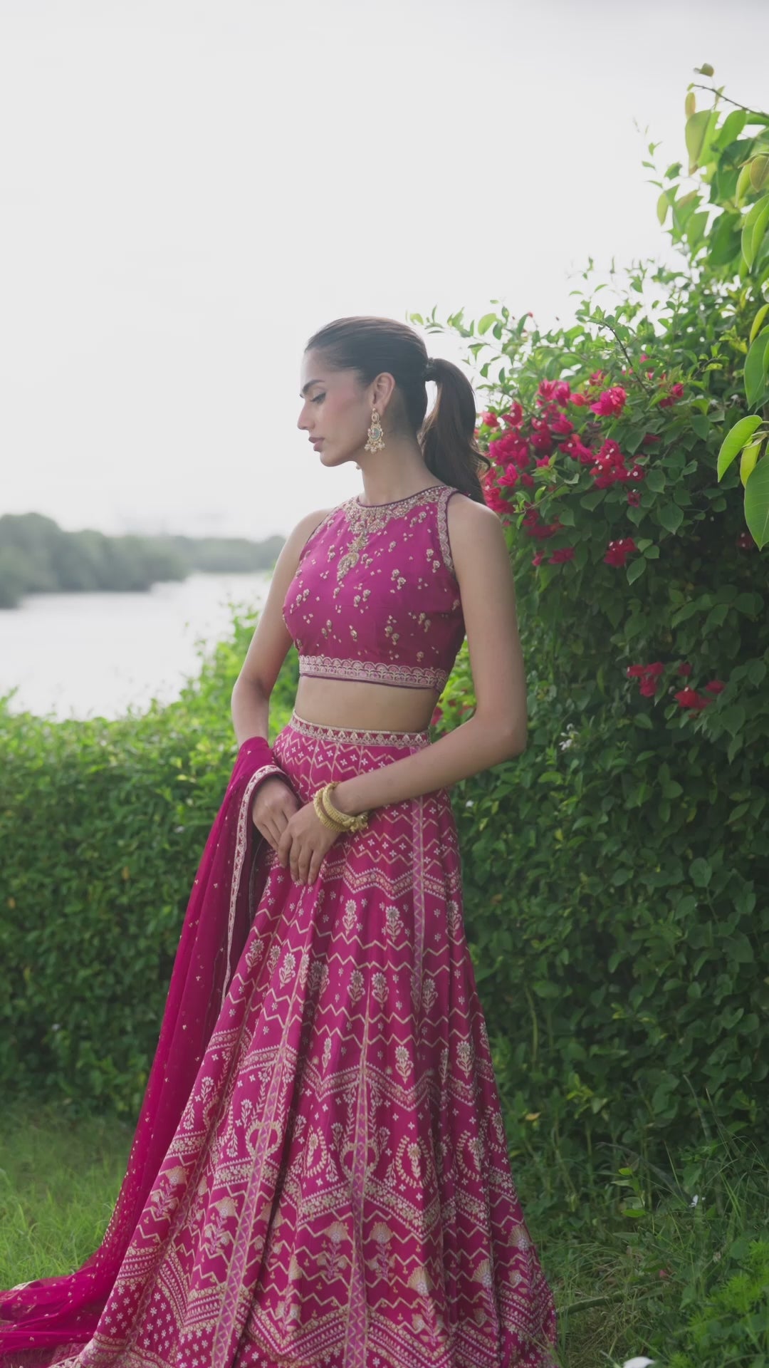 Unapologetically glamorous — this berry pink ensemble brings together contemporary edge and timeless elegance. The raw silk lehenga features a striking digital print framed with shimmering zari borders, creating a captivating play of pattern and sheen. Paired with a sleek halter top, intricately hand-embellished with zardozi and resham detailing, the look radiates confident sophistication.