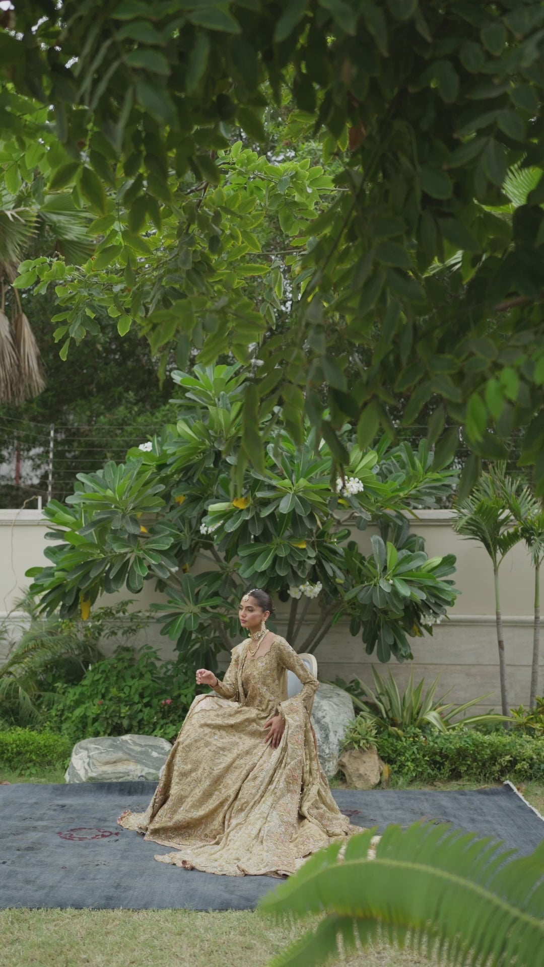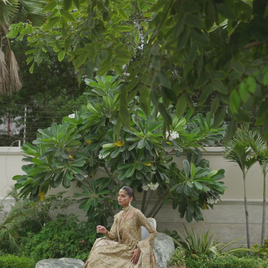 Cast in radiant gold, this bridal ensemble captures timeless majesty softened with whispers of pastel romance. The pure zari tissue kalidaar shimmers with zardozi craftsmanship, its surface alive with kora, dabka, sequins, crystals, tilla, and resham embroidery in pale pink and green hues, weaving a story of delicate elegance upon a luminous base. The chantilly lace dupatta frames the silhouette with refinement, finished with a heavier scalloped border on one side and narrow scallops along the others, its surface glistening with a spray of sequins and crystals that dance across the lace. Completing the grandeur, the pure zari jamawar lehnga falls into a long, sweeping train, its wide border echoing the embellishments of the kalidaar, creating harmony and depth. A bridal designed for radiance and grace — regal in presence, yet softened with the poetry of pastels.
