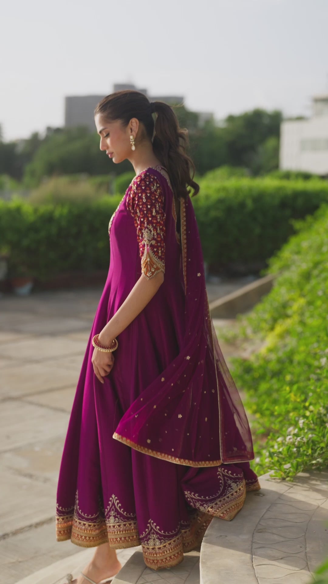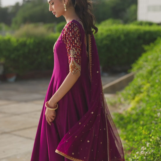 Radiating timeless elegance with a touch of festive flair, this deep amethyst raw silk ensemble is a masterclass in effortless glamour. The luminous jewel tone shimmers beautifully in motion, while the fluid drape of pure silk gives it an irresistibly luxe appeal. The meticulously hand-embroidered neckline and statement sleeves — adorned with classic gota, ari, zardozi, and pearl embellishments — reflect FTA’s signature craftsmanship. A vibrant tulle dupatta completes the look, adding a refreshing burst of color and sophistication.