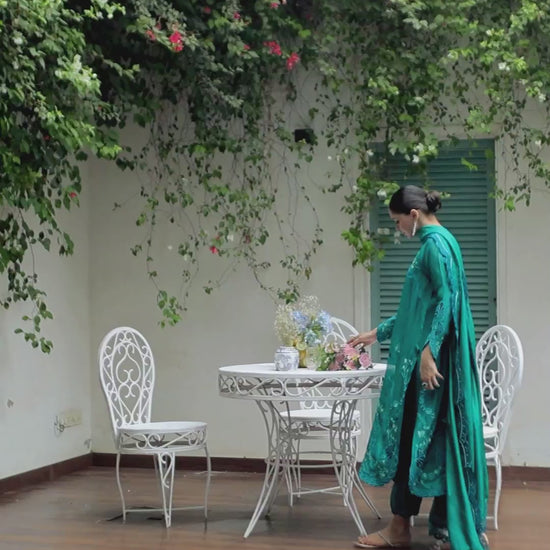 A lush Persian green is richly embroidered with silk thread work and while the universally flattering neckline and sleeves are adorned with an array of sparkling Swarovski crystals, pearls and sequins. Delicate embroidered motifs add the perfect amount of glamour.