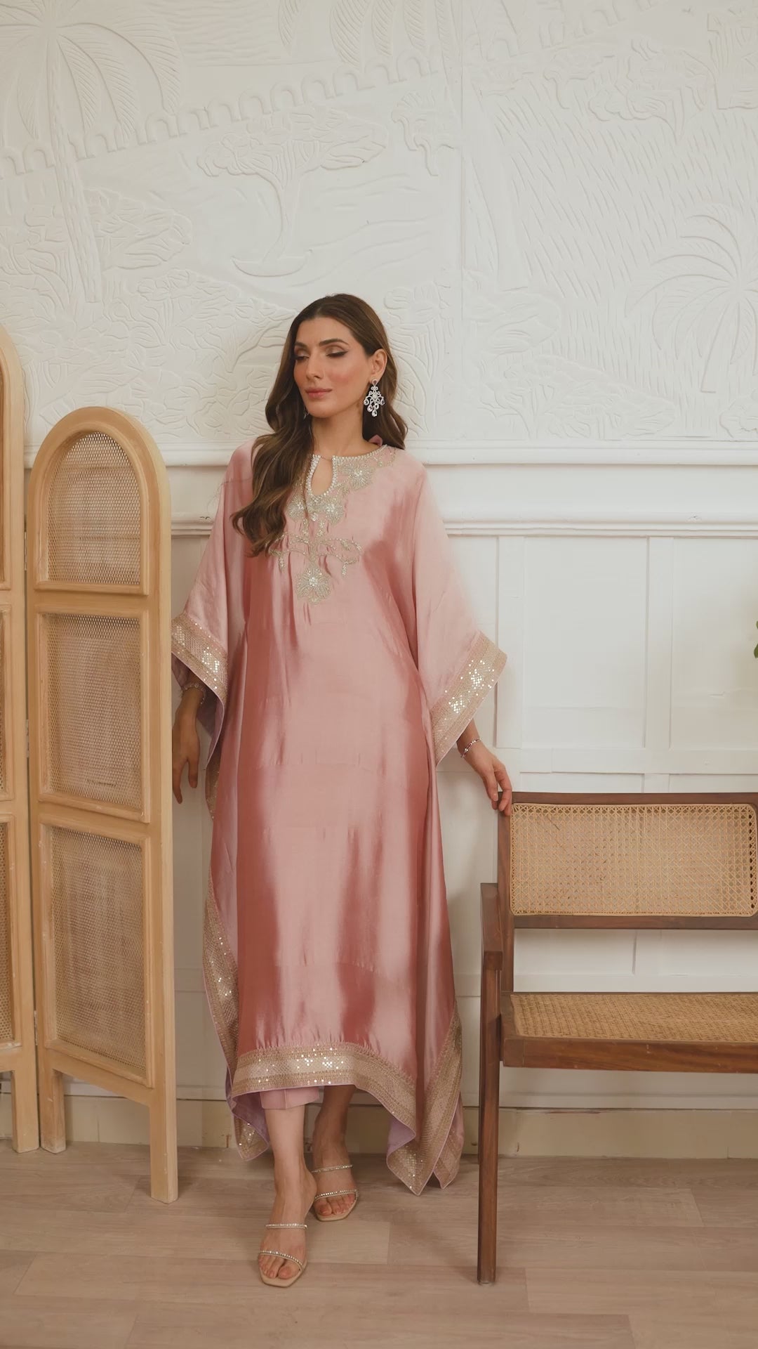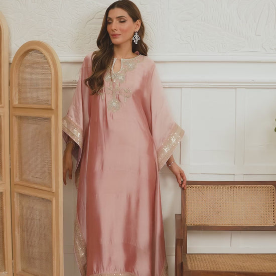 Cut from fluid, breathable shiny silk, this kaftan is a flattering blush pink. The ankle grazing hem, round keyhole neckline and hem are hand embellished with pearl and silk threadwork. An easy breezy silhouette that elevates your style with its flowy, uber flattering cut.