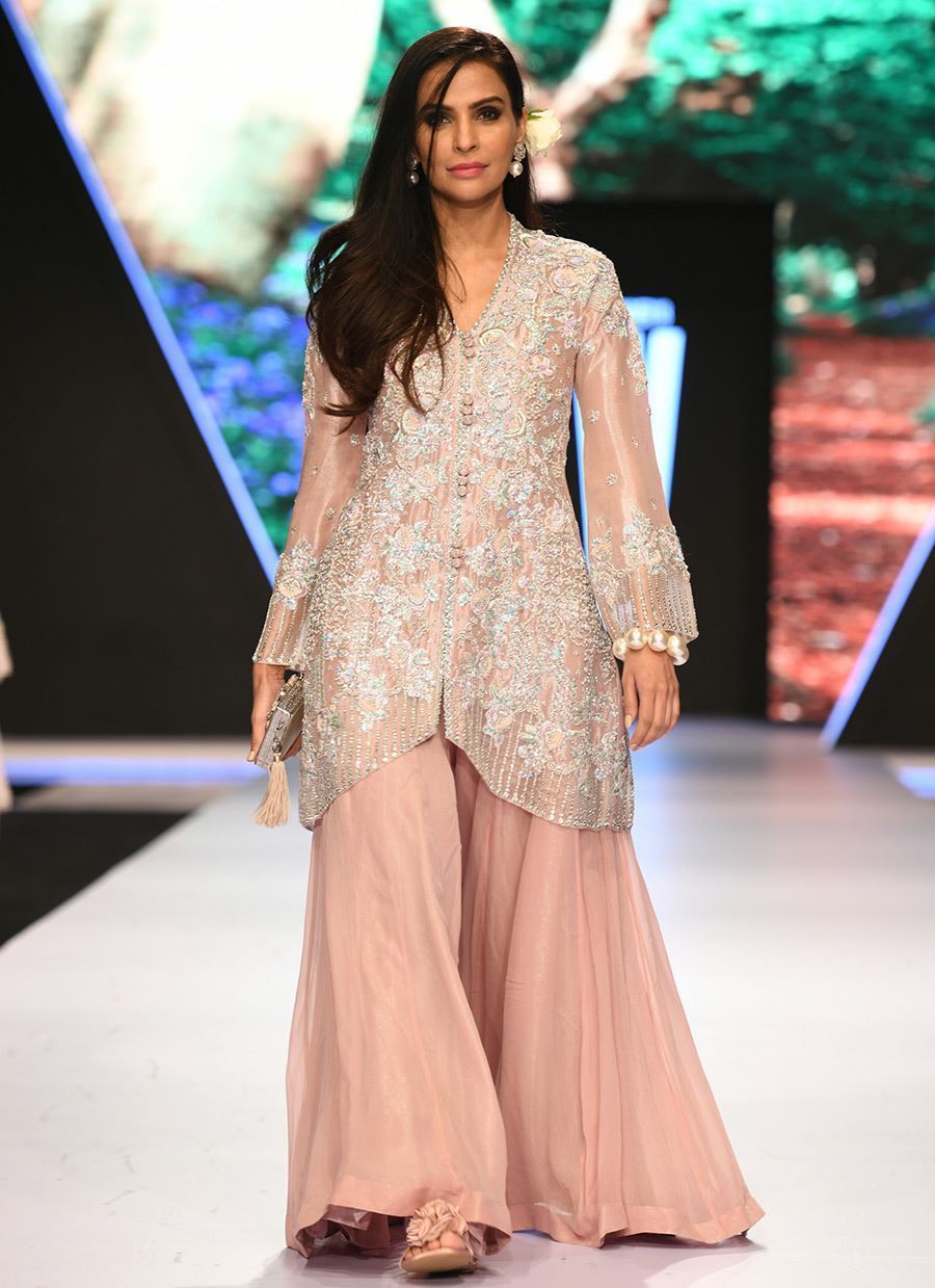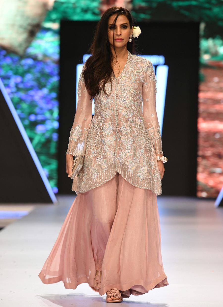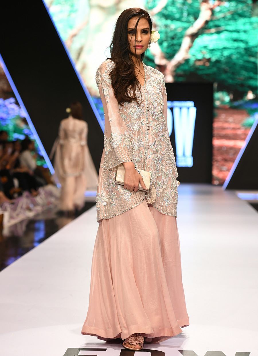 Shimmery shirt embellished with resham and ticky stones. It comes with a chiffon dhaka pajama.