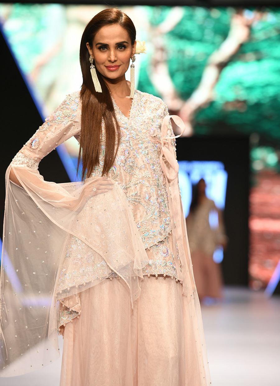 Tea pink shimmery shirt embellished with ticky stones, pearls and net sleeves. It comes with a chiffon dhaka pajama.