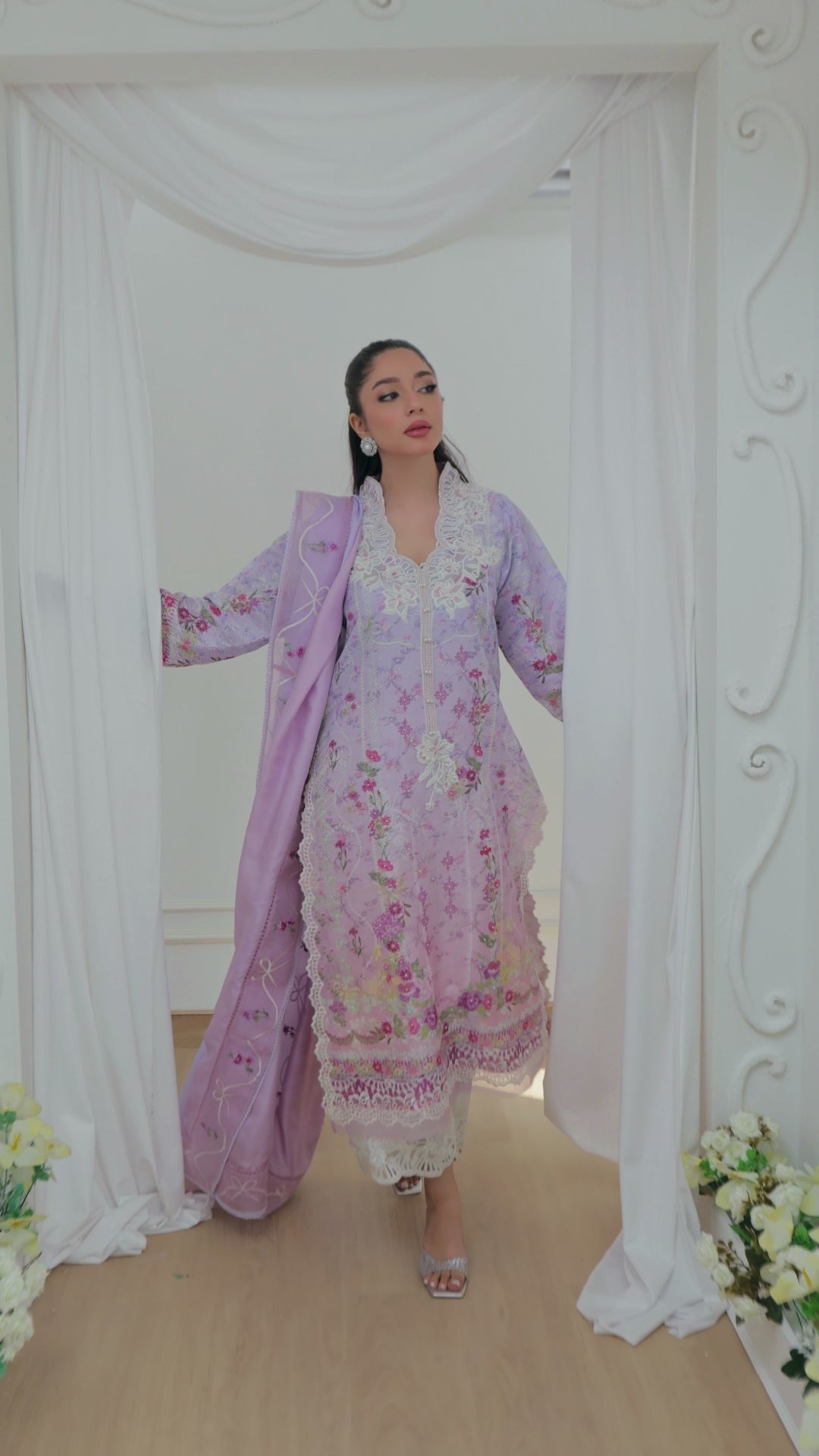 Infused with the signature FTA aesthetic, our new prints have the perfect pastel hues to set your heart aflutter!! Cut from sumptuous raw silk, the shirt is given a striking ombre treatment, with a crisp lavender that flows smoothly into a blush pink. Whimsical florals bloom daintily all over the shirt, making this an absolute must have. The relaxed, much loved silhouette has a universally flattering neckline, adorned with delicate hand-made floral motifs, pearls and sequins, add an easy timeless elegance. A two tone pure medium silk dupatta brings the look together with graceful flair. Pair yours with our embroidered cutwork pants as shown.