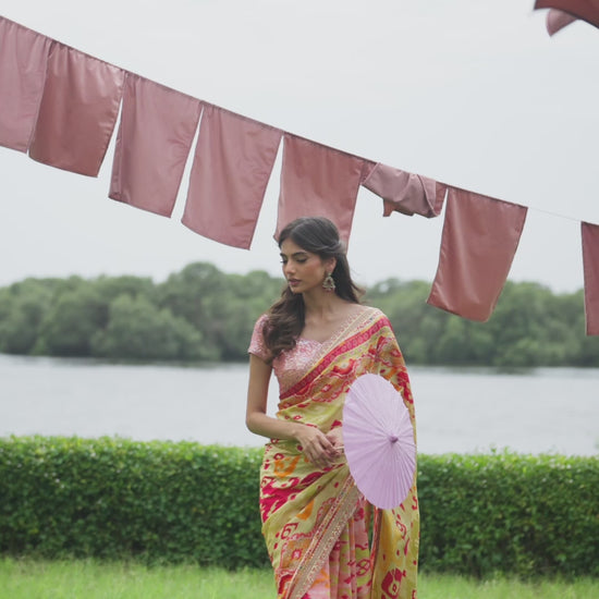 Finished with delicate zari borders that shimmer softly with every move, it perfectly balances vibrance and elegance. The blush pink blouse, adorned with tonal sequins and dainty silk thread work florals, adds a hint of texture and romance—making this the ultimate festive statement for the season.