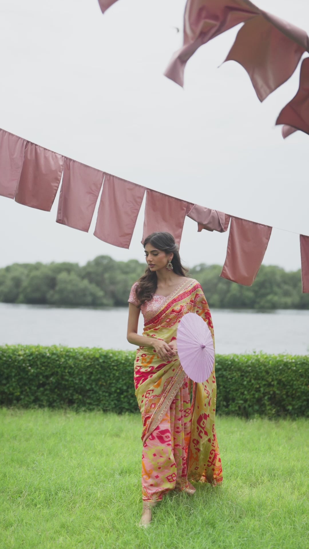 The classic saree silhouette is given a contemporary twist, with an eye-catching digital print.