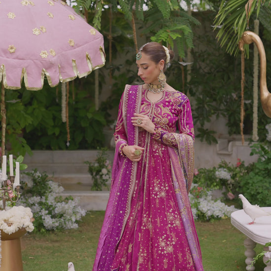 The meticulously selected unique shade of magenta is the festive color of the season. The voluminous kalidaar that has an appliqued daaman comes with a high front slit which ultimately makes it the most flattering silhouette. The pure cotton net shirt is beautifully embellished with intricate gold zardozi, dabka, sequins, and silver zari, naqshi, gota. This elegant kalidaar is complemented with a charmeuse block printed lehenga. The exceptionally beautiful ensemble is an absolute showstopper. The dupatta featured with it is a hand embellished chunri chaddar along with an embellished pure net dupatta which gives the dress a fancy finish that will no doubt leave everyone amazed. The perfect combination of colors makes it a unique outfit which will give the bride a gorgeously royal look