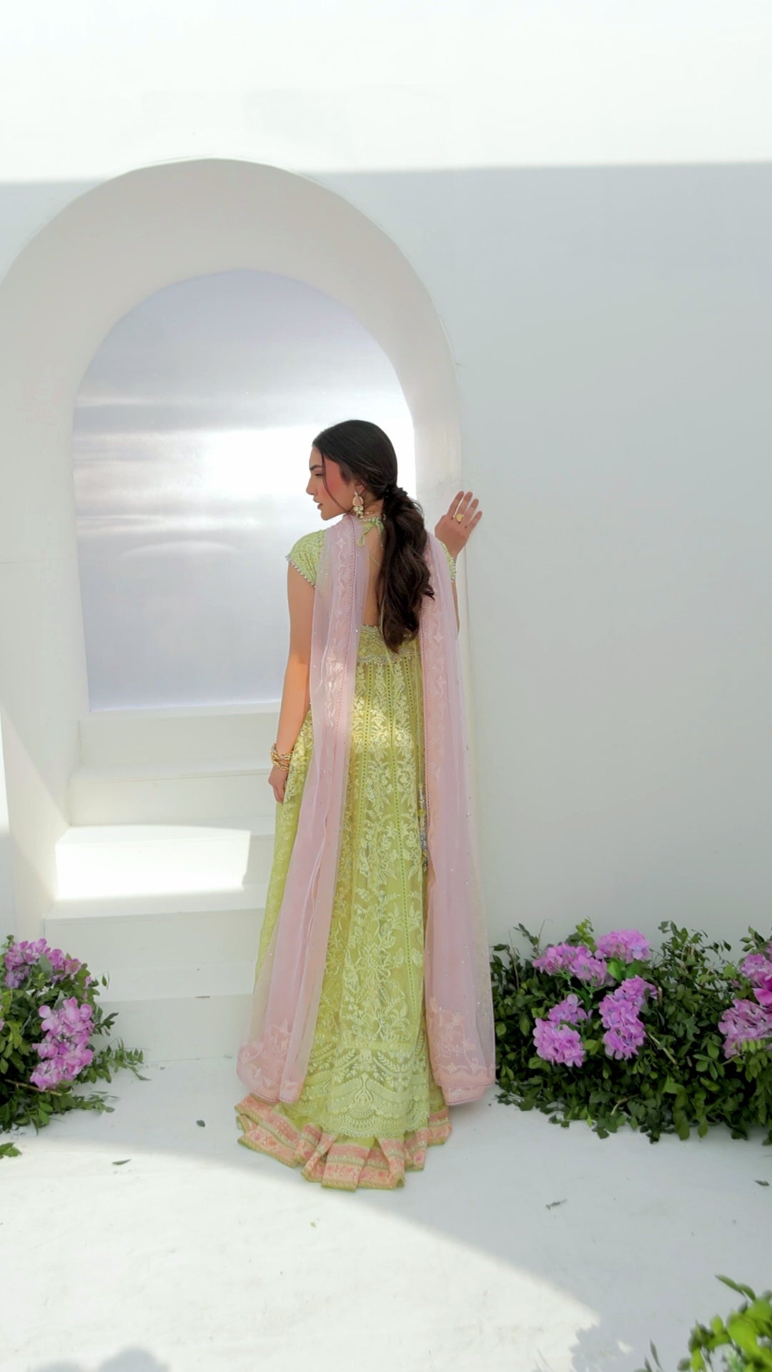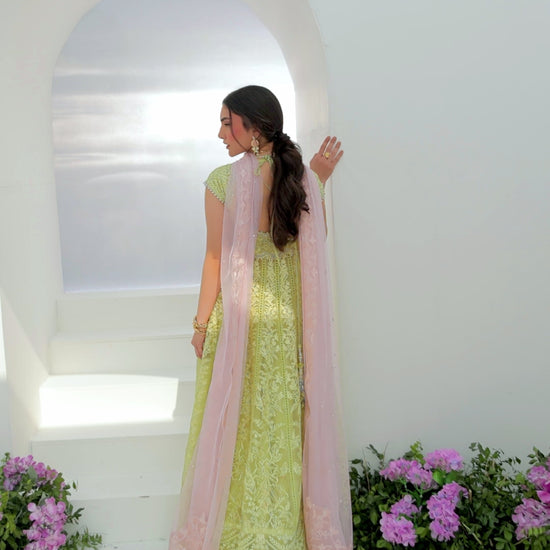 kiwi organza, the Reine ensemble strikes the perfect balance between elegant and eye-catching. This flowing kalidaar is richly embroidered with intricate, silk threadwork, while the bodice is further uplifted with silver and pearl hand embellishment and little pops of pale pink blooms. The cascading panels flow gracefully bringing irresistible movement to the ensemble.