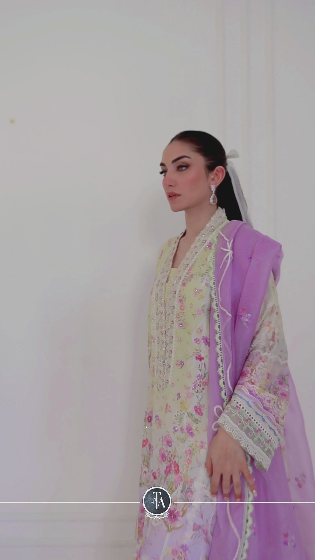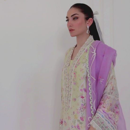 Infused with the signature FTA aesthetic, our new prints have the perfect pastel hues to set your heart aflutter!! Cut from sumptuous raw silk, the shirt is given a striking ombre treatment, with a fresh apple green that flows smoothly into a pale lilac. Romantic florals bloom daintily all over the shirt, making this an absolute must have. The relaxed, much loved silhouette has a universally flattering neckline, adorned with delicate hand-made floral motifs, pearls and sequins, add an easy timeless elegance comes with a lilac organza dupatta adorned with embroidered summer blooms and a playful border featuring bows, adding a graceful flair to the ensemble. Complete the look with our pure silk embroidered cutwork pants.