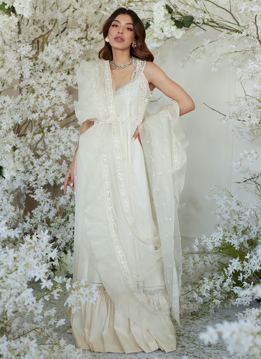 This dramatic, exquisitely flowing Saree dress, in a stunning shade of ivory, will have all eyes on you.