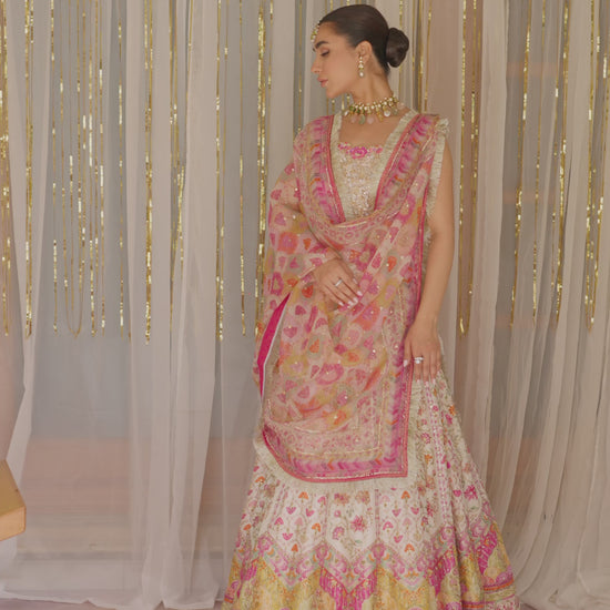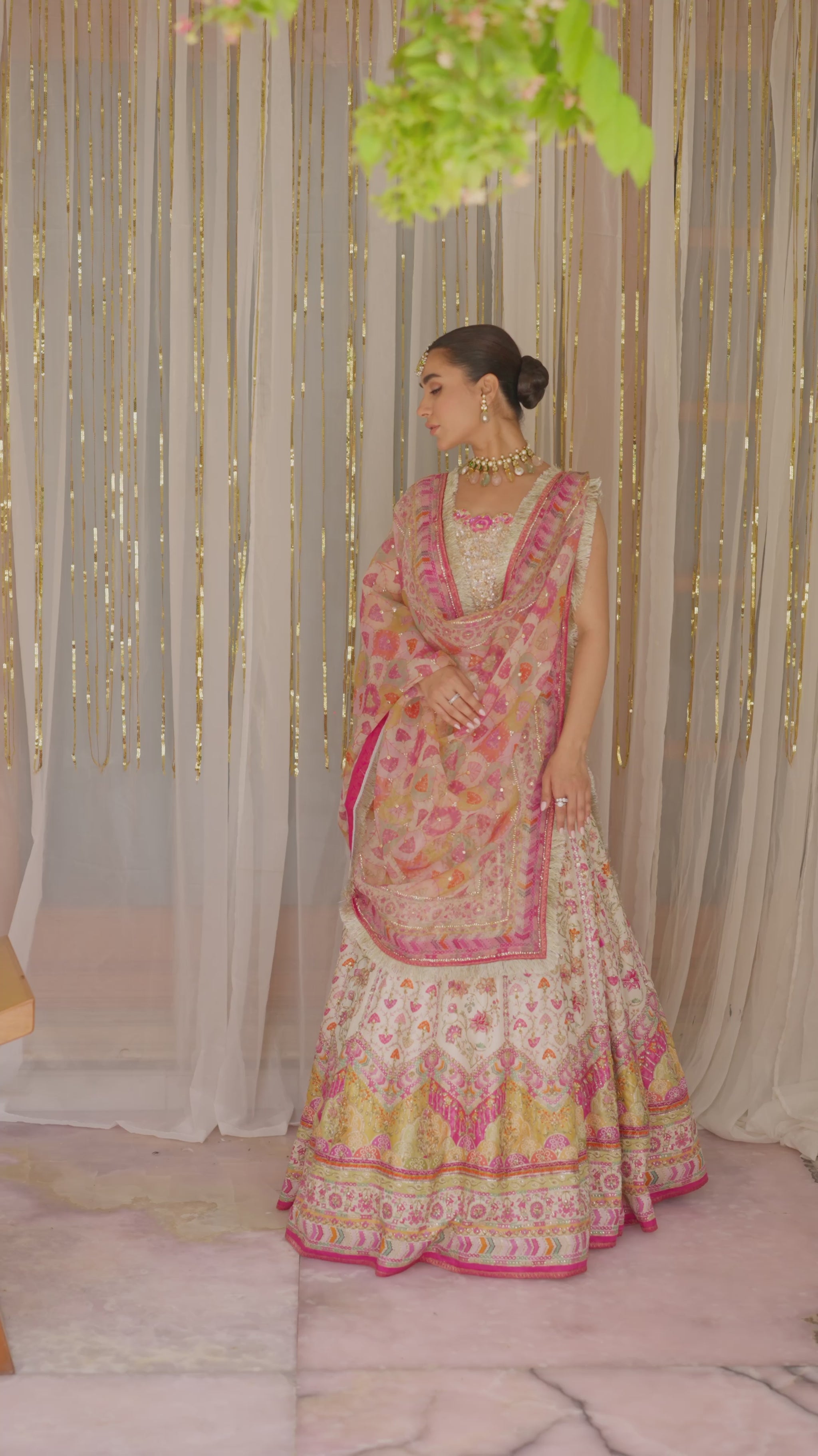 Stand out in a stunning ivory lehenga choli that is heavily embellished with pre-dominantly gold gota, sequins, dabka, Swarovski crystals and nakshi work. The contemporary color palette of the lehenga gives a modern oomph to the outfit. The spectacular choli, handcrafted with Swarovski crystals, sequins and thread work makes you shine amongst the crowd. The colorful dupatta in pure organza features a beautiful print all over handcrafted in zardozi and ari work. Densely embellished with a triple sequins spray for that extra sparkle.