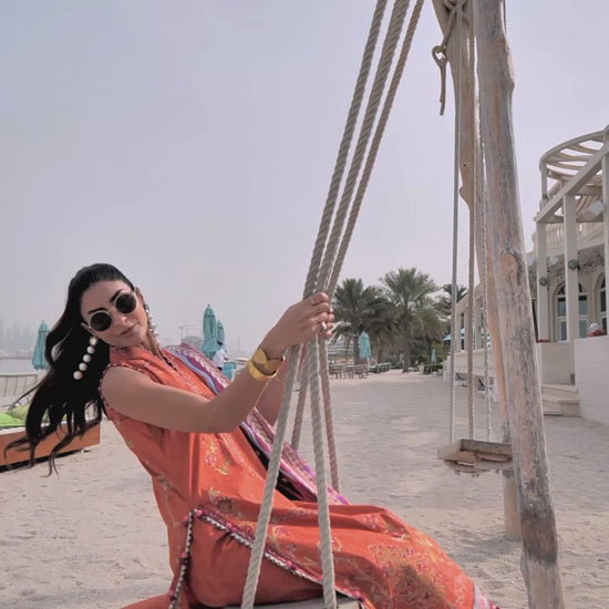 Rita Rust is an intense, burnt orange hue, richly embroidered vibrant, uplifting shades to keep it fresh, yet timelessly glam. The pure medium silk dupatta in ties in with the embroidery and simply uplifts the entire ensemble completely effortlessly. The comfortable, jacquard pants will keep you breezy day or night. Intricately detailed, inspired blooming botanicals, Rita Rust is sure to fill your sun-kissed days with breezy moments, and unforgettable memories.