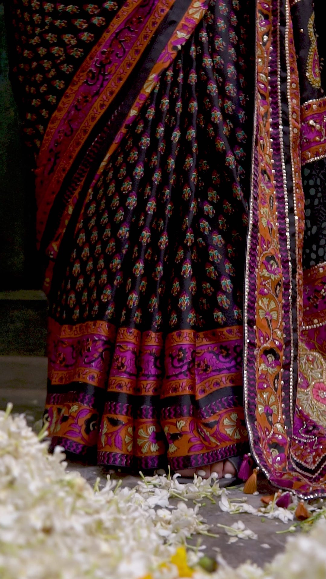 A Stunning charmeuse hand blocked black sari showcases a striking blend of shades with vibrant pink and orange accents. The pallu is the highlight, beautifully adorned with intricate cutwork and exquisite handwork details that include kora, dabka, and Swarovski stones, creating a mesmerizing and luxurious effect. Paired with the sari is a sleek black blouse featuring embellished straps, adding a contemporary touch to the traditional ensemble. The embellished straps on the blouse perfectly complement the detailed pallu, creating a cohesive and sophisticated look. This ensemble is perfect for evening events and special occasions, where the blend of vibrant colors, intricate handwork, and modern elements come together to create a stunning and unforgettable outfit.
