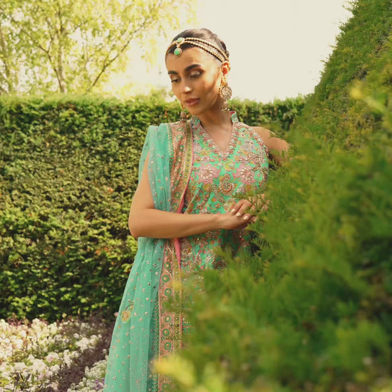 A true classic and one of our most cherished ensembles of the season! This fresh and elegant look is crafted in delicate shades of mint and kiwi, bringing together soft pastels and vibrant undertones in a beautifully balanced harmony. The ensemble features a hand-blocked short shirt in soothing mint tones, uplifted with kiwi accents that add depth and dimension to the print. The silhouette is both flattering and timeless, perfect for daytime festivities and refined celebrations. The shirt is intricately embellished with traditional kora, dabka, sitara, and fine appliqué work, each detail meticulously hand-rendered to showcase artisanal finesse. The embellishments are designed to shimmer subtly against the mint base, creating an effect that’s luxurious yet understated. Paired with this is a set of hand-blocked Dhaka pants in matching mint and kiwi, featuring sitara chann and fine gota detailing, along with a finely hand-worked border that adds richness and structure to the flowy silhouette.