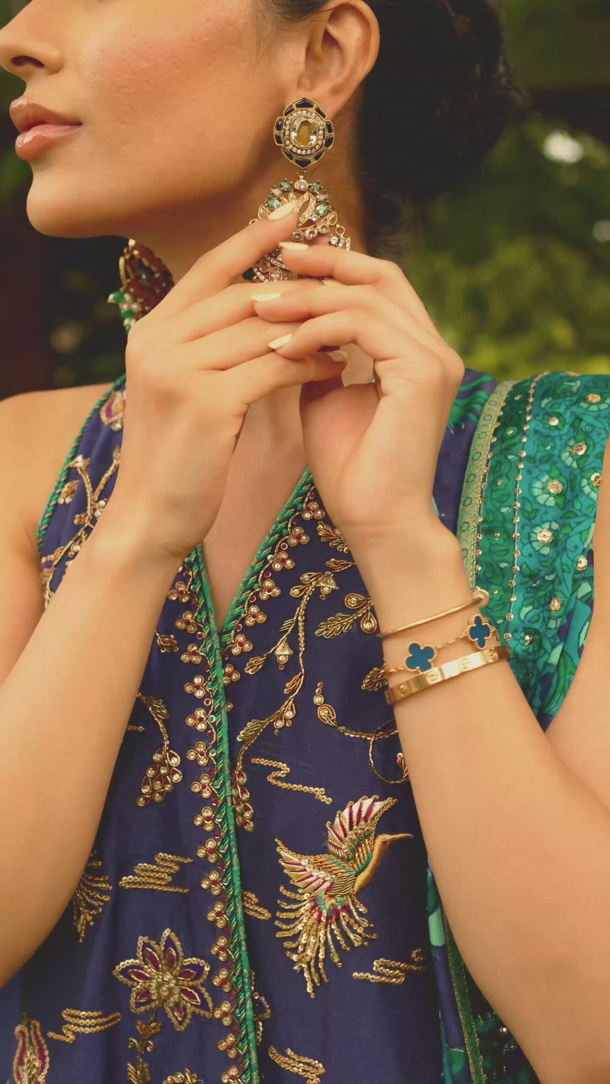 The look features a luxurious teal raw silk short shirt crafted in an elegant angrakha-cut style. This alluring silhouette is adorned with intricate kora, dabka, sitara, and applique work, showcasing the richness of traditional hand embellishment. The shirt is beautifully finished with a hand-embellished blue border that adds a touch of depth and sophistication to the overall look. Paired with the shirt are hand-blocked teal Dhaka pants, brought to life with sitara chann, gota detailing. The vibrant hues and intricate craftsmanship of the pants add texture, movement, and a refined festive flair to the outfit.