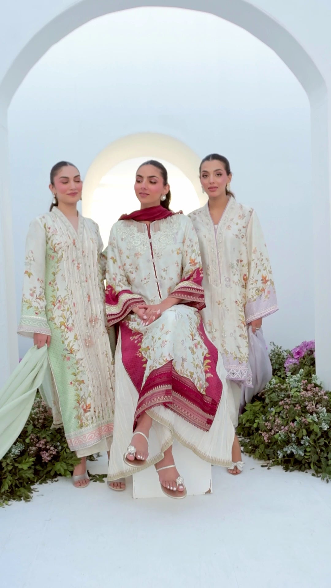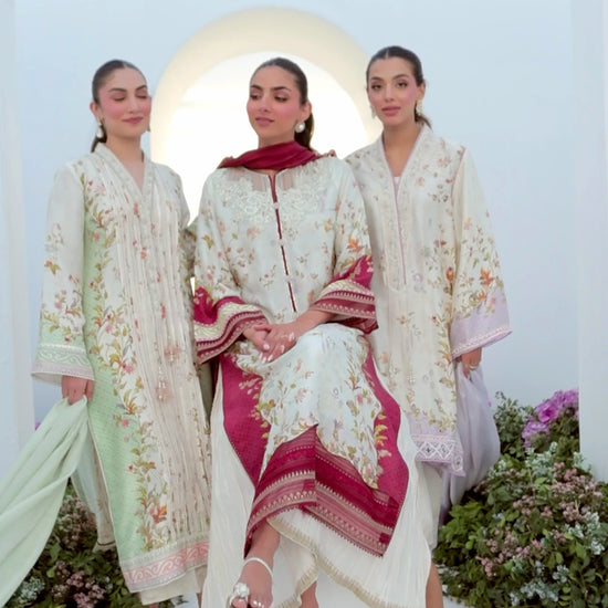 Brimming with signature FTA details and romance, the Sangria Trellis ensemble is impossible to resist! Cut from sumptuous raw silk, the relaxed, much loved silhouette has an ivory canvas with rich crimson on the sides. A universally flattering neckline, adorned with delicate hand-made floral motifs, pearls, sequins on organza appliqued on to the pure raw silk shirt. The elegant, A-line cut is paired with a pure medium silk dupatta in crimson, trimmed with organza embroidered with vibrant blooms. Finish the look with our pure silk, crushed pants (as pictured) and a sleek high ponytail for the ultimate chic vibe!!