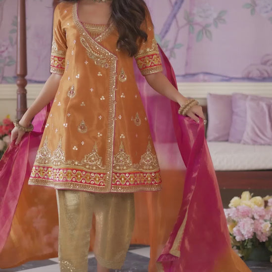 The signature Farah Talib Aziz colour palette brings your festivities to life. This short angharka has a heavy embellished shirt with intricate, gold zari and Swarovski handwork. Paired with a digitally printed organza dupatta, with gota embroidery and unmissable hand-made tassels.