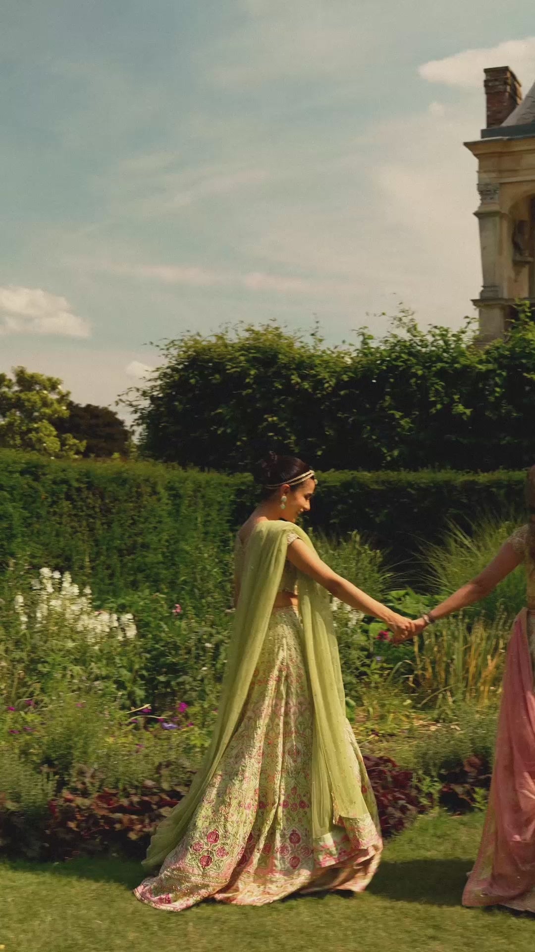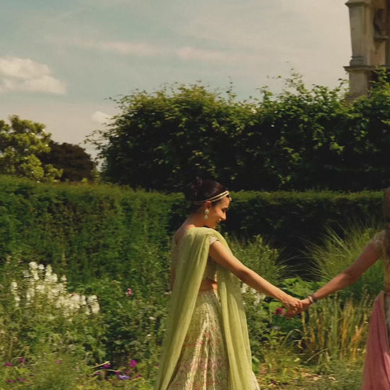 Step into a garden of dreams with Azella, a fresh and radiant celebration of color and craftsmanship. This kiwi green printed lehenga bursts to life with painterly accents of blush pinks and rich pomegranate motifs, capturing the essence of a blooming orchard in spring.