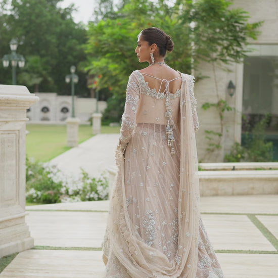 A vision of timeless grace and femininity, this pale pink ensemble captures the essence of refined bridal elegance. A dreamy pale pink net kalidaar, intricately embellished with exquisite zardozi handwork, delicate 3D floral appliqués, shimmering Japanese cutdana, and soft Resham embroidery. Paired with a regal jamawar farshi lehnga that adds timeless grandeur to the silhouette. The look is completed with a matching net dupatta, beautifully adorned with coordinating embellishments — creating a romantic and elegant ensemble, perfect for a modern bride with a love for traditional craftsmanship.