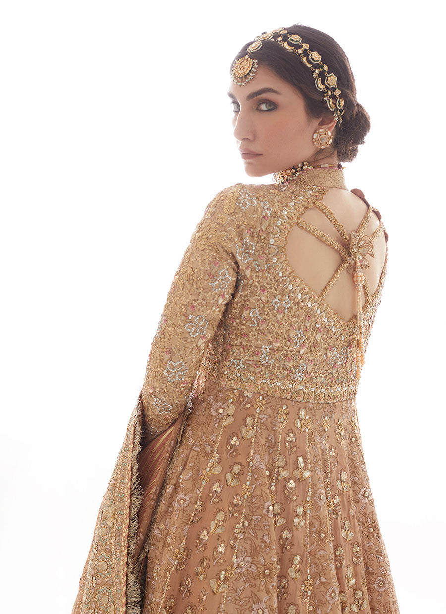 Wear this Farah Talib Aziz Signature ensemble to a wedding, special event, or any occasion where you want to make a statement. The combination of the rose gold tissue, intricate handwork, and elegant lehnga creates a stunning look that is sure to leave a lasting impression. The shirt and dupatta are crafted from rose gold tissue, adorned with intricate block print and delicate handwork layered over it. The champagne gold sequins, gota, tilla handwork, and silk threadwork in shades of pale pink and mint green add a touch of glamour and elegance to the ensemble. The pink net lehnga is the perfect complement to the shirt and dupatta. It features elegant swirls at the bottom, creating a mesmerizing and graceful look. The lehnga is designed to flow gracefully as you move, making you feel like royalty.