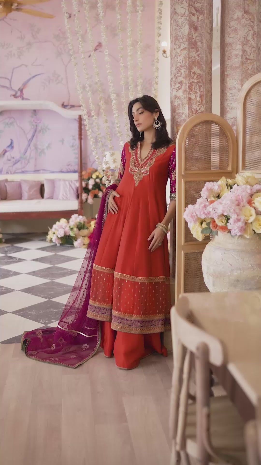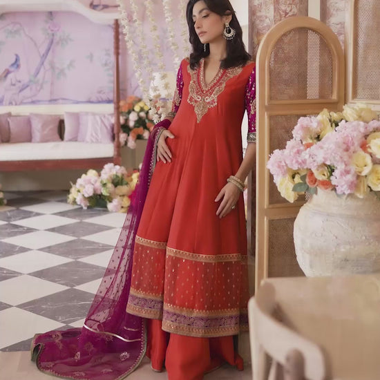 Gracefully flowing kalis, a magenta tulle dupatta and pure raw silk wide leg pants all come together to create the ultimate scene stealing ensemble.