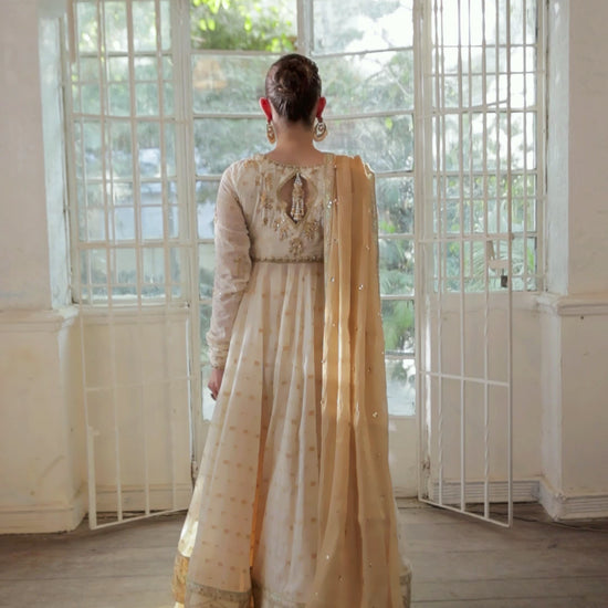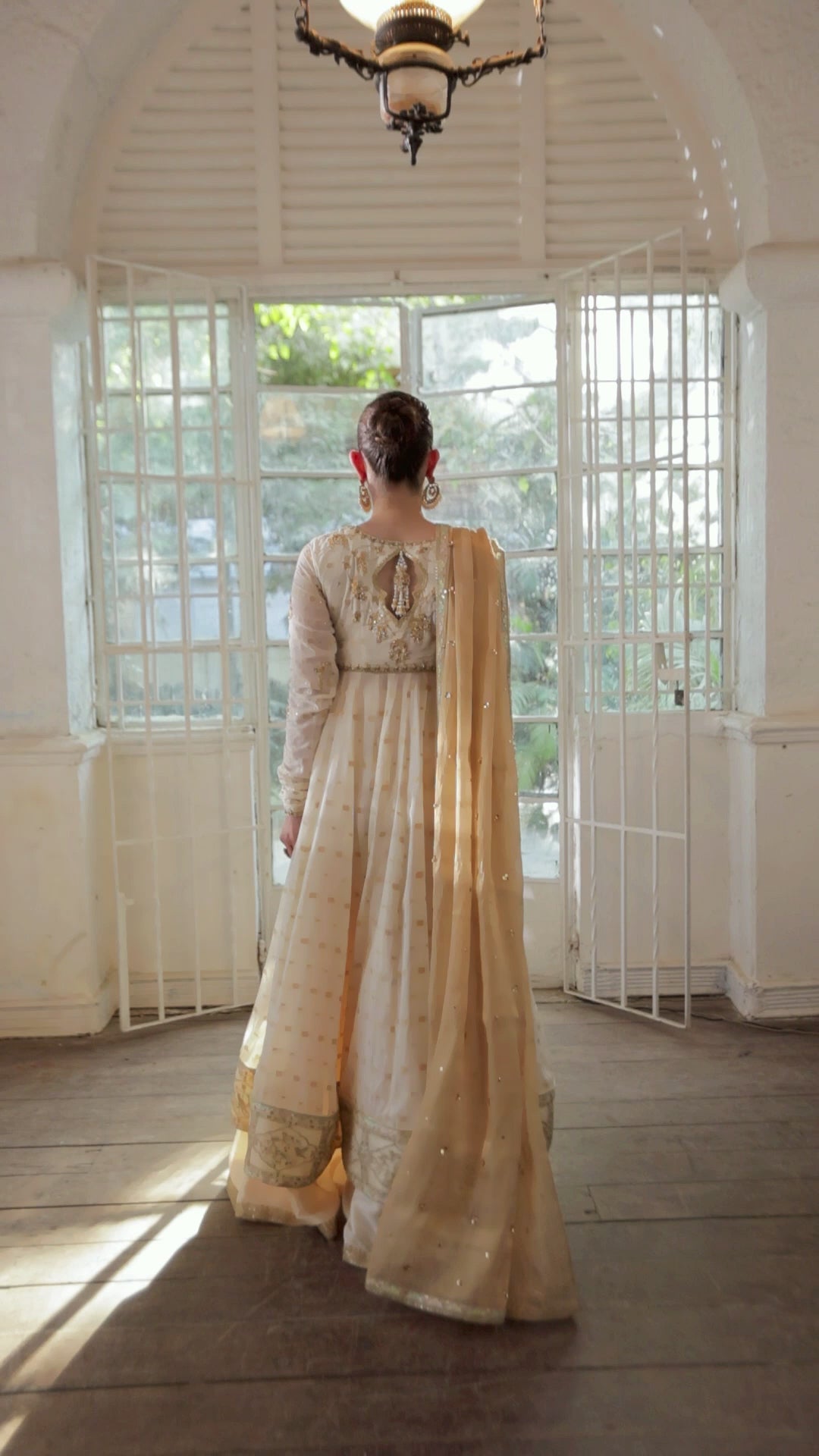 Ivory voluminous kalidaar with asymmetrical double neckline and elegant churidaar sleeves.
