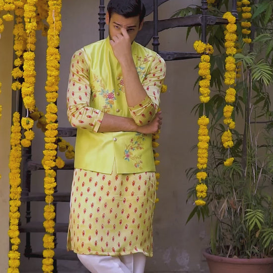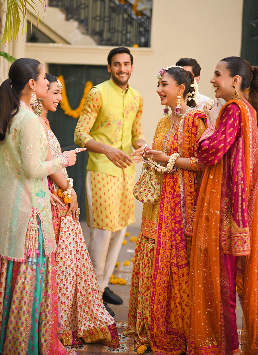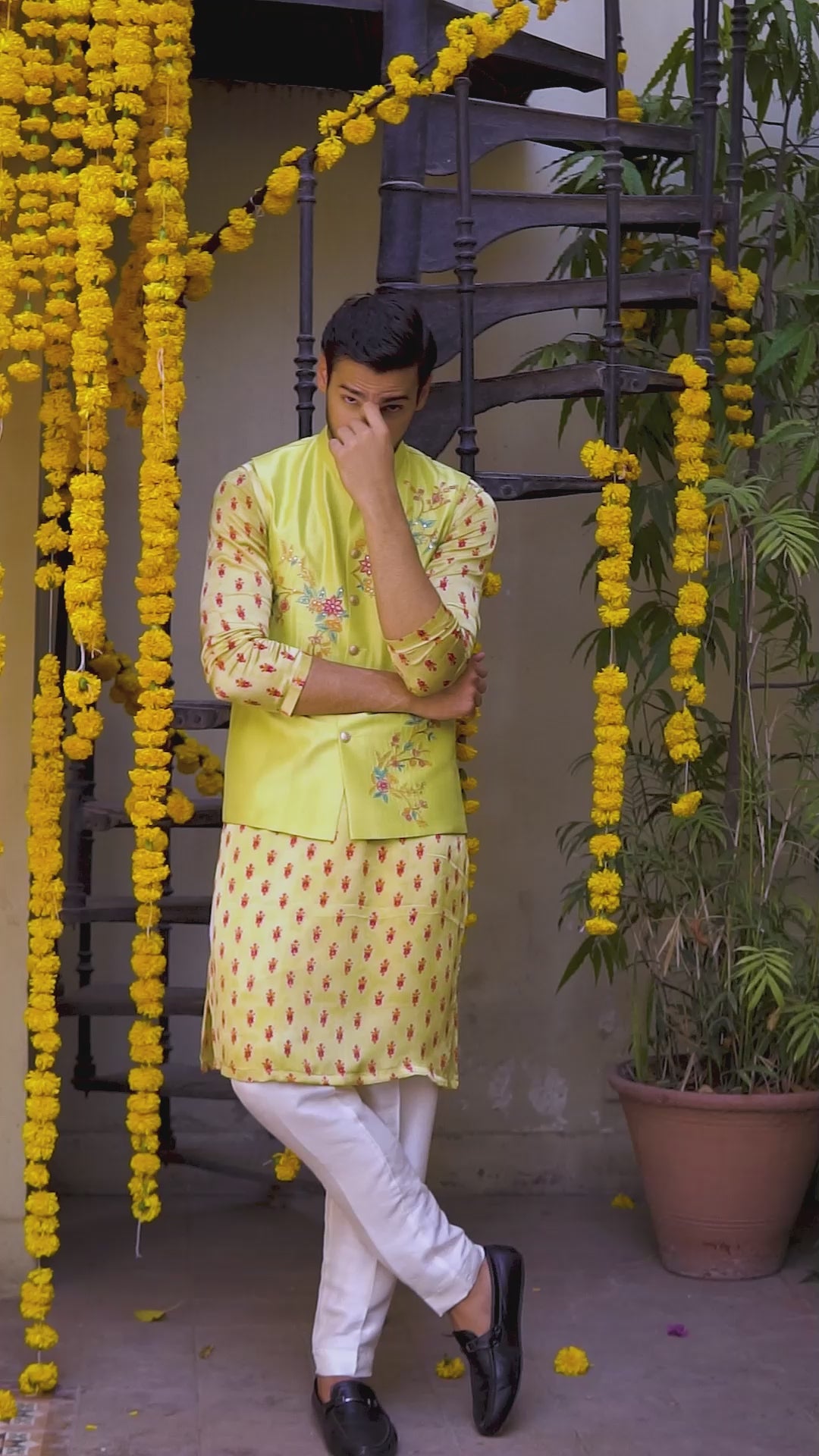 Farah Talib Aziz’s foray into menswear results in a sleek, pared down approach to the traditional festive ensemble for men, a block printed yellow kurta that brings a vibrant and cheerful touch to the outfit. The intricate block printing adds a layer of texture and detail, making the kurta visually appealing and rich in traditional craftsmanship. The vibrant color of the kurta paired with the detailed, ornate waistcoat ensures a striking yet harmonious ensemble that is both traditional and contemporary.