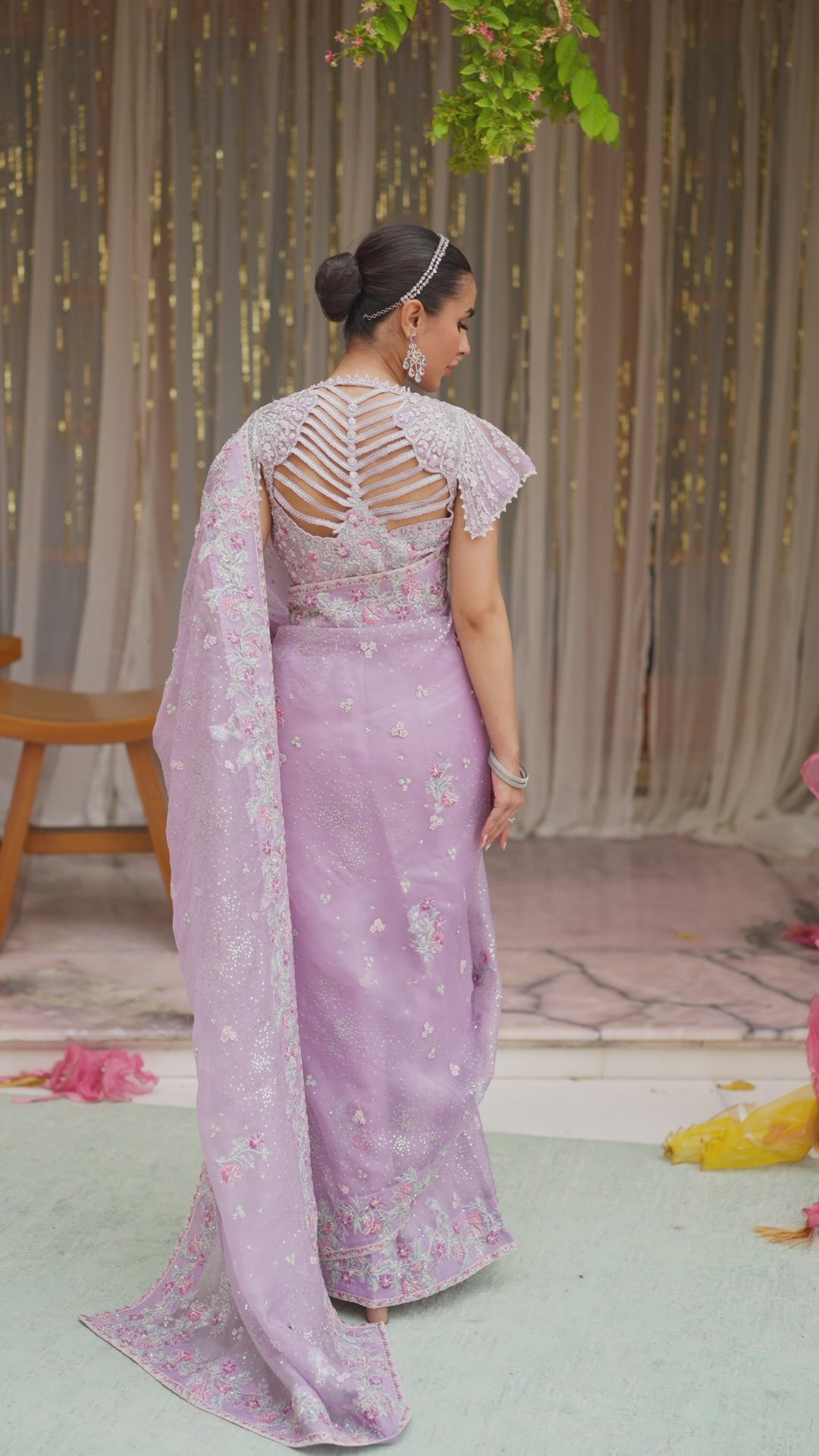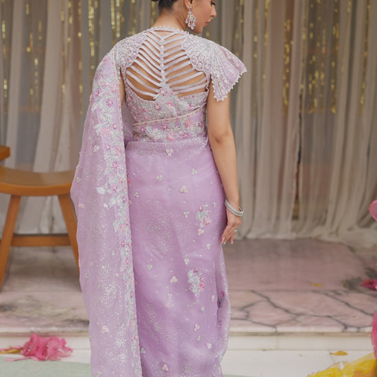 An absolutely unmissable saree, cut from elegant lavender organza. Adorned with intricate thread work, 3d florals, Swarovski crystals and pearls it is truly a piece of art. Paired with an impeccably tailored blouse cut from lavender zari silk. The blouse has an uber-flattering neckline with elegant organza short sleeves.