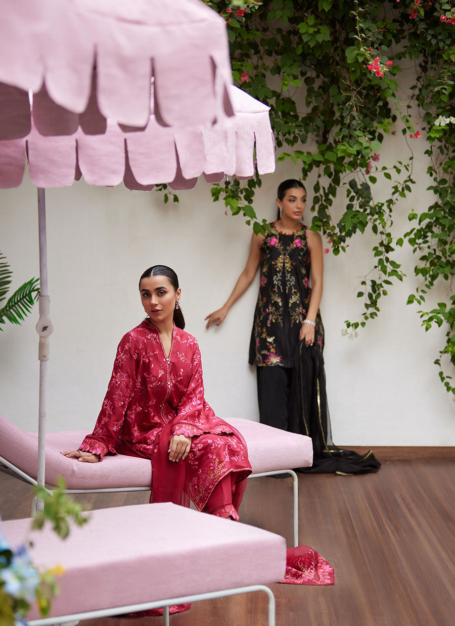 This effortlessly chic and classy ivory silhouette will declare you the best dressed wherever you go. Absolutely fitting for the spring season, the pure raw silk short shirt features a round neckline that sits close to the neck with a flattering incut armholes and side slits. It is decorated with vibrant embroidered botanical motifs all over the shirt that bring a kaleidoscope of uplifting floral hues. Paired with loose voluminous flared pants that accentuate the length of this fit and an organza dupatta with embroidered lace finishing, this look will steal the moment this season and every season that follows.