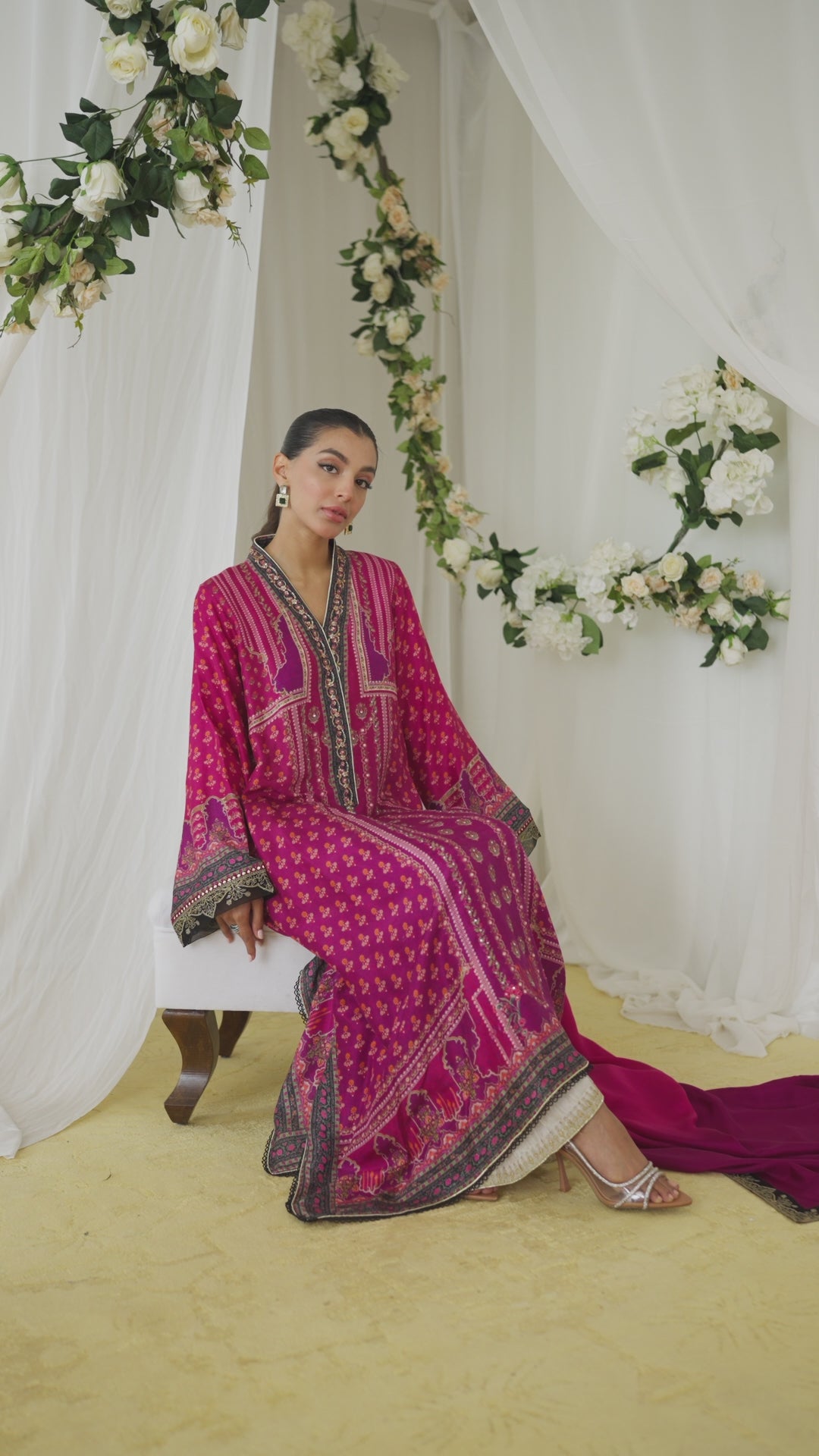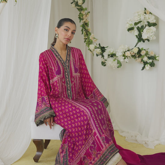 A canvas of vibrant magenta is emblazoned with an exclusively designed FTA digital print and embroidery on the neckline and sleeves. The accompanying pure medium silk dupatta with stunning embroidered borders completes your ensemble. Eternally stylish, irresistible details will make this one of your smartest buys this season!
