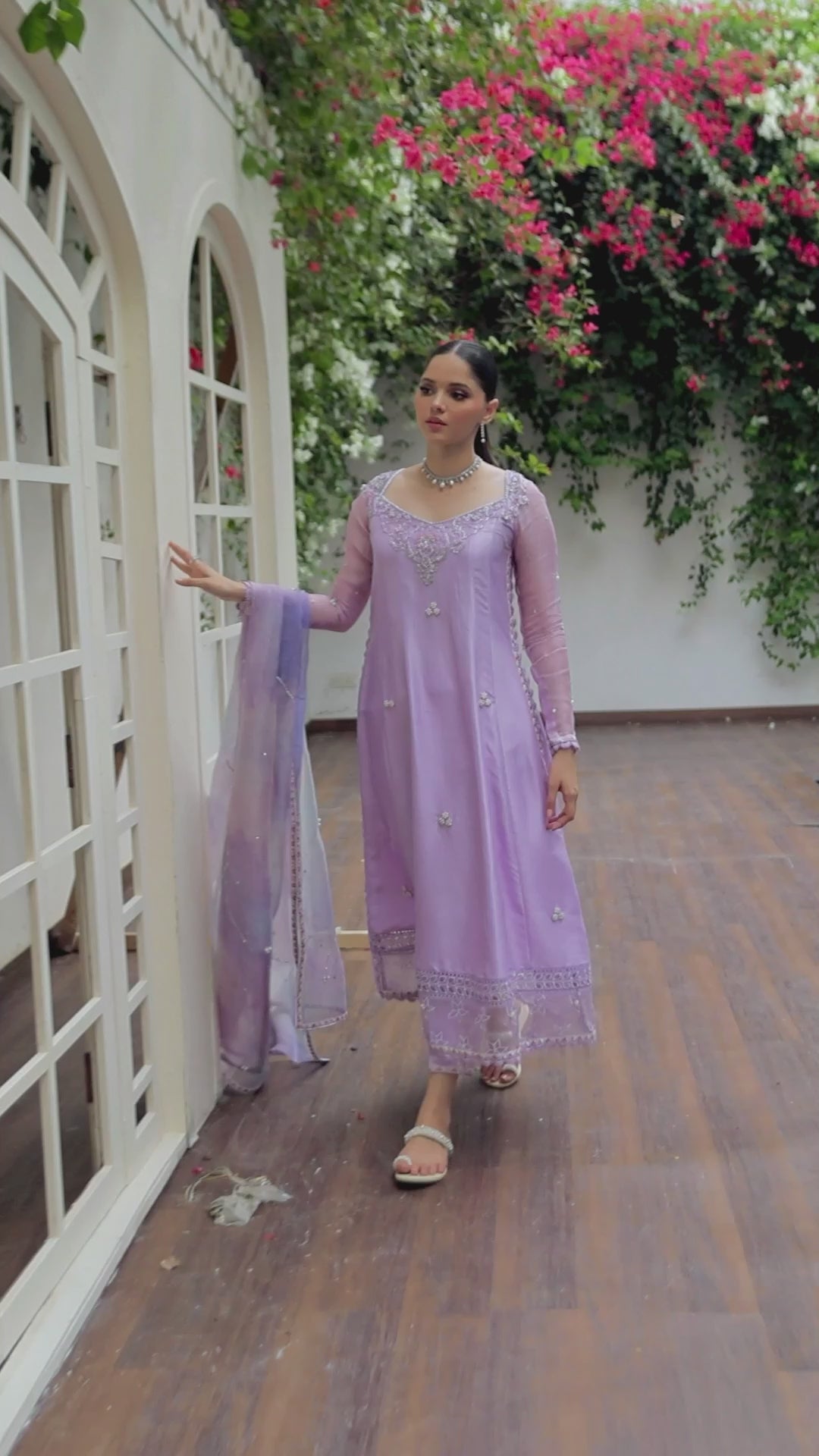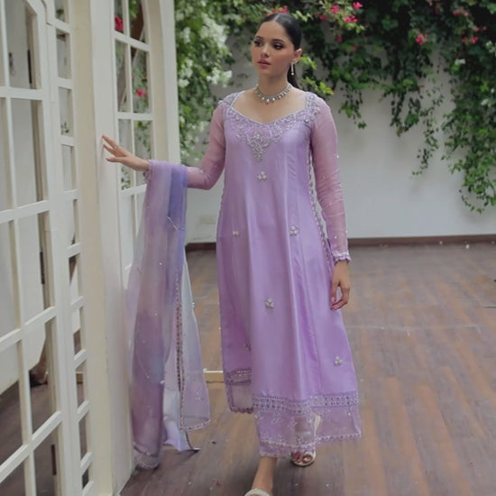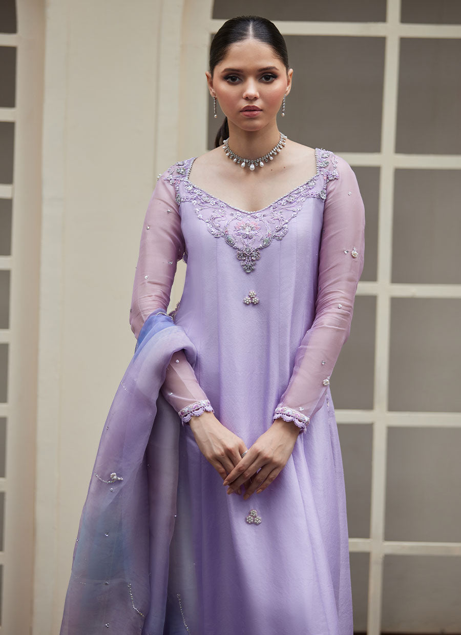 A divine shade of lilac raw silk is adorned with delicate neckline hand-worked with floral motifs, brought to life with shimmering silver and pearls.