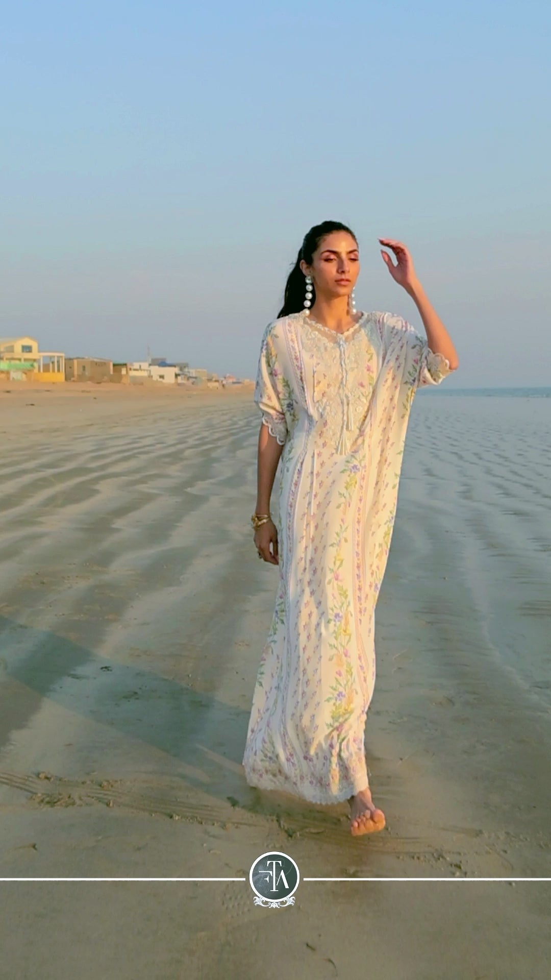 Designed in-house at the FTA Studio in Karachi, each of our digital prints is created with extreme attention to detail. Cut from pure Crepe Silk this pristine ivory kaftan is delicately decorated with refreshing summer blooms in a myriad of pastel colours. A universally flattering, relaxed silhouette is further enhanced by a hand-worked neckline ivory silk threadwork, with pearls and sequins on ivory organza applique appliqued on the sharp ‘V’ neck. Hand crafted pearl tassels make this, perfectly draped, easy breezy kaftan sure to be your go-to this festive season. Finish off your ensemble with sparkly flats to have heads turning no matter where you go.