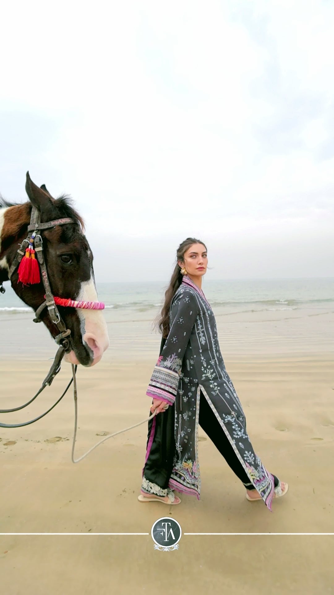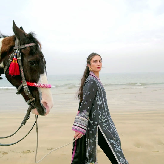 A deep onyx hue, with eye catching pops colour is further enhanced with hand embellished pearls and sequins.