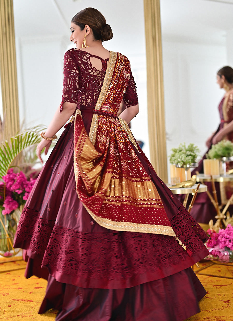 A striking garnet hued kalidaar, cut from lustrous kataan silk, with delicate cutwork, done by hand to create eye-catching bodice and border.