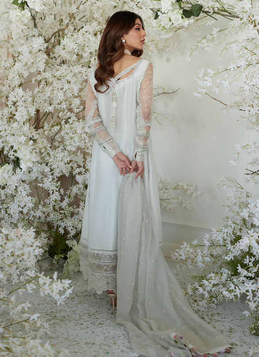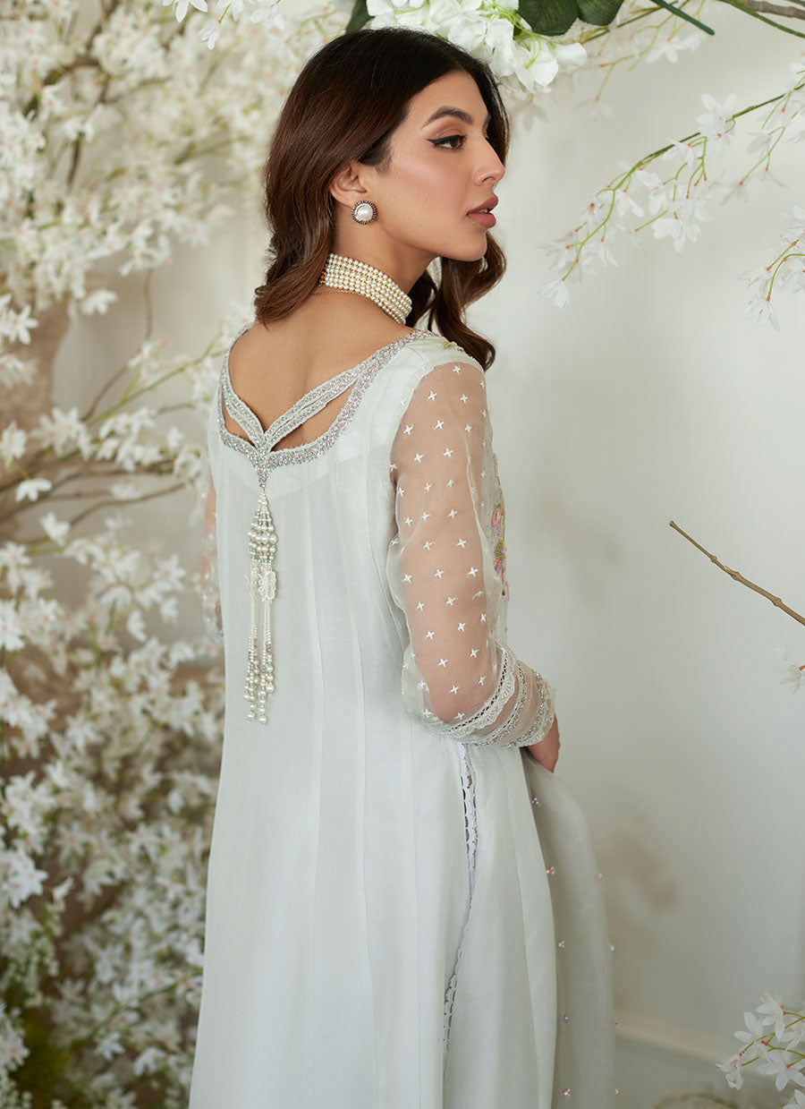 An organza dupatta, decorated with dainty little pearl motifs is trimmed with playful pastel tassels and adds a distinctly elegant flair to your final look.