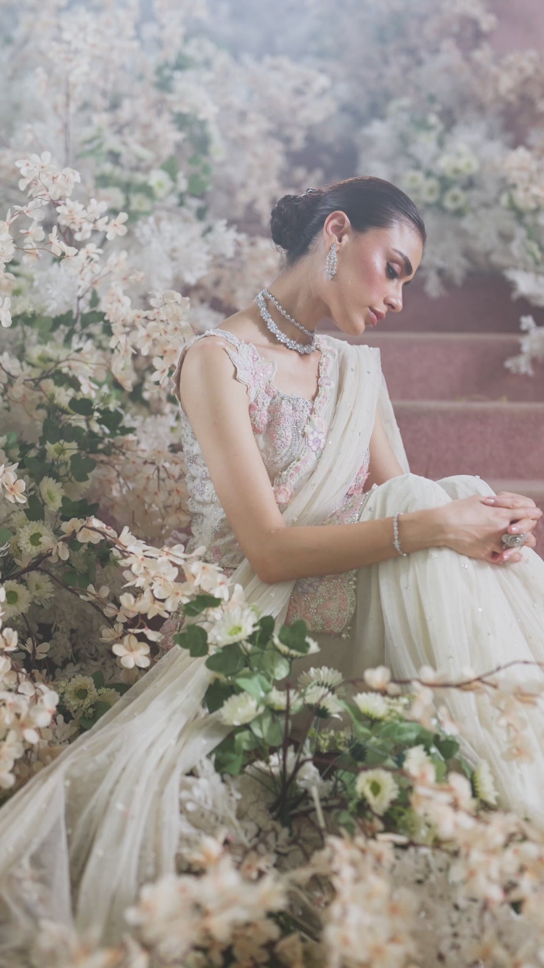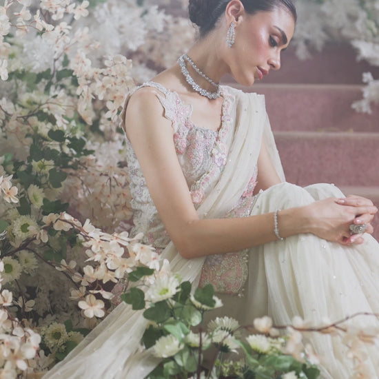 It is paired with an exquisitely embellished pure net dhaka, and a beautifully shaded ombré net dupatta in soft pink and white tones. The dupatta is delicately edged with lace, enhancing its ethereal charm. A timeless ensemble, perfect for intimate festivities or elegant soirées.