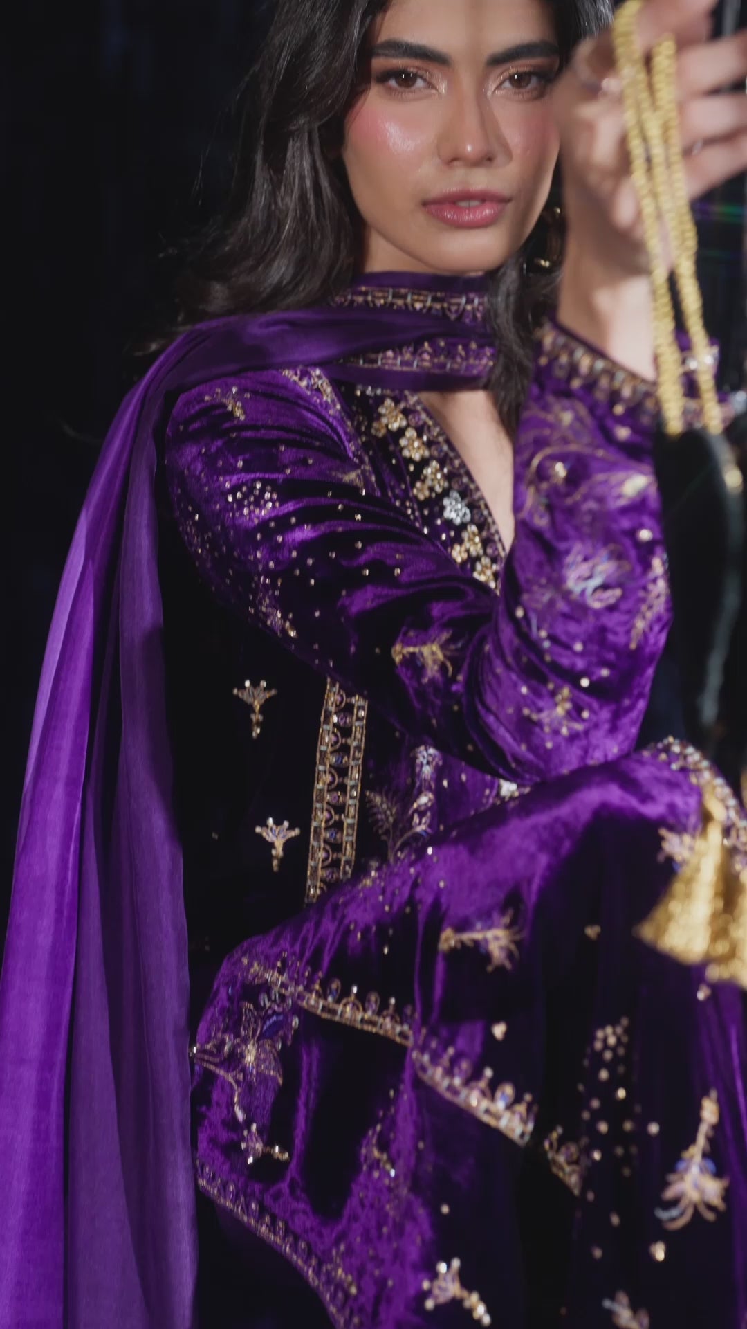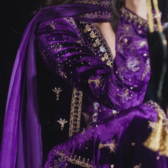 A regal masterpiece in deep purple — this velvet overlap style shirt, exudes timeless allure with its extensive zari and zardozi handwork, meticulously crafted to perfection. The richly detailed embroidery enhances the luxurious texture of the velvet, creating a statement look steeped in tradition yet undeniably modern. Paired with coordinating purple izaar pants and a dip-dyed dupatta finished with a delicate zari border, this ensemble radiates graceful sophistication and festive grandeur.